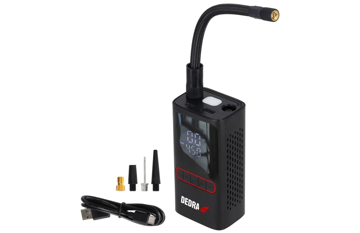 The pump is compatible with popular types of valves, equipped with an ergonomic pressure gauge with a display and a convenient charging port. The sturdy metal and plastic construction ensures durability, while the thoughtful design makes it easy to store and transport.