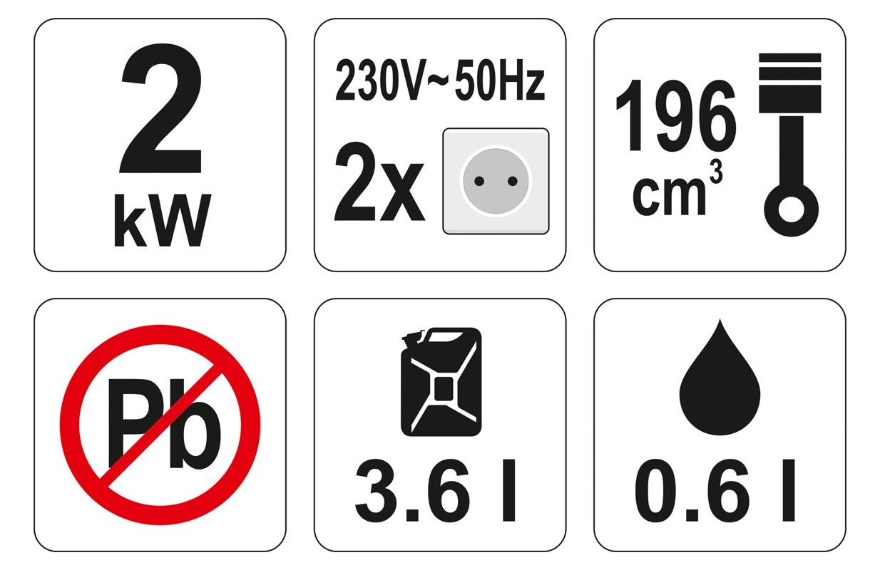 Warning 1. Read the operating instructions and labels before starting work. 2. Attention! Exhaust gas is toxic. Do not operate the generator indoors without adequate ventilation. 3. Keep children away from the generator. 4. Do not refill fuel and oil while the generator is running. 5. If the generator will be placed in a closed room, measures must be taken to prevent fire and explosion. 6. Do not connect the generator to the home electrical network. 7. Do not use the generator in high humidity conditions. 8. Keep flammable products away from the generator. 9. When refueling: - stop the engine, - do not smoke, - do not spill fuel.Technical data