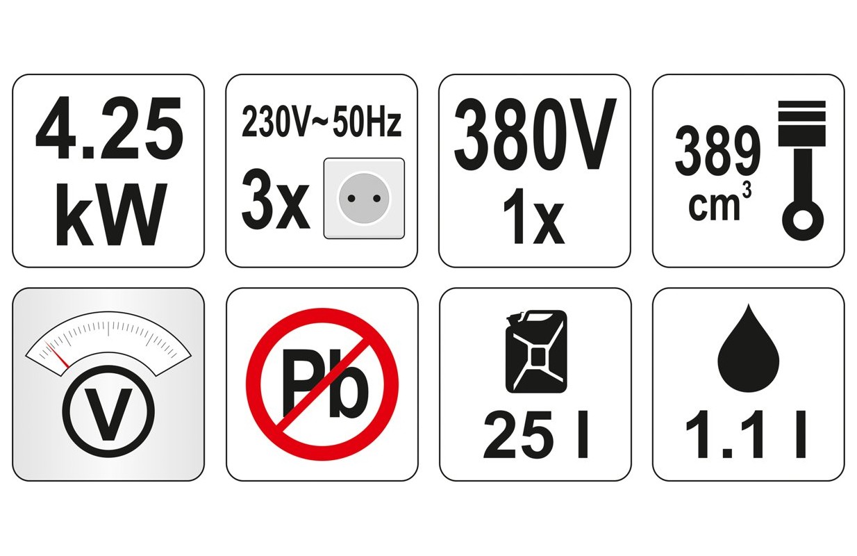 Warning 1. Read the operating instructions and labels before starting work. 2. Attention! Exhaust gas is toxic. Do not operate the generator indoors without adequate ventilation. 3. Keep children away from the generator. 4. Do not refill fuel and oil while the generator is running. 5. If the generator will be placed in a closed room, measures must be taken to prevent fire and explosion. 6. Do not connect the generator to the home electrical network. 7. Do not use the generator in high humidity conditions. 8. Keep flammable products away from the generator. 9. When refueling: - stop the engine, - do not smoke, - do not spill fuel.Technical data