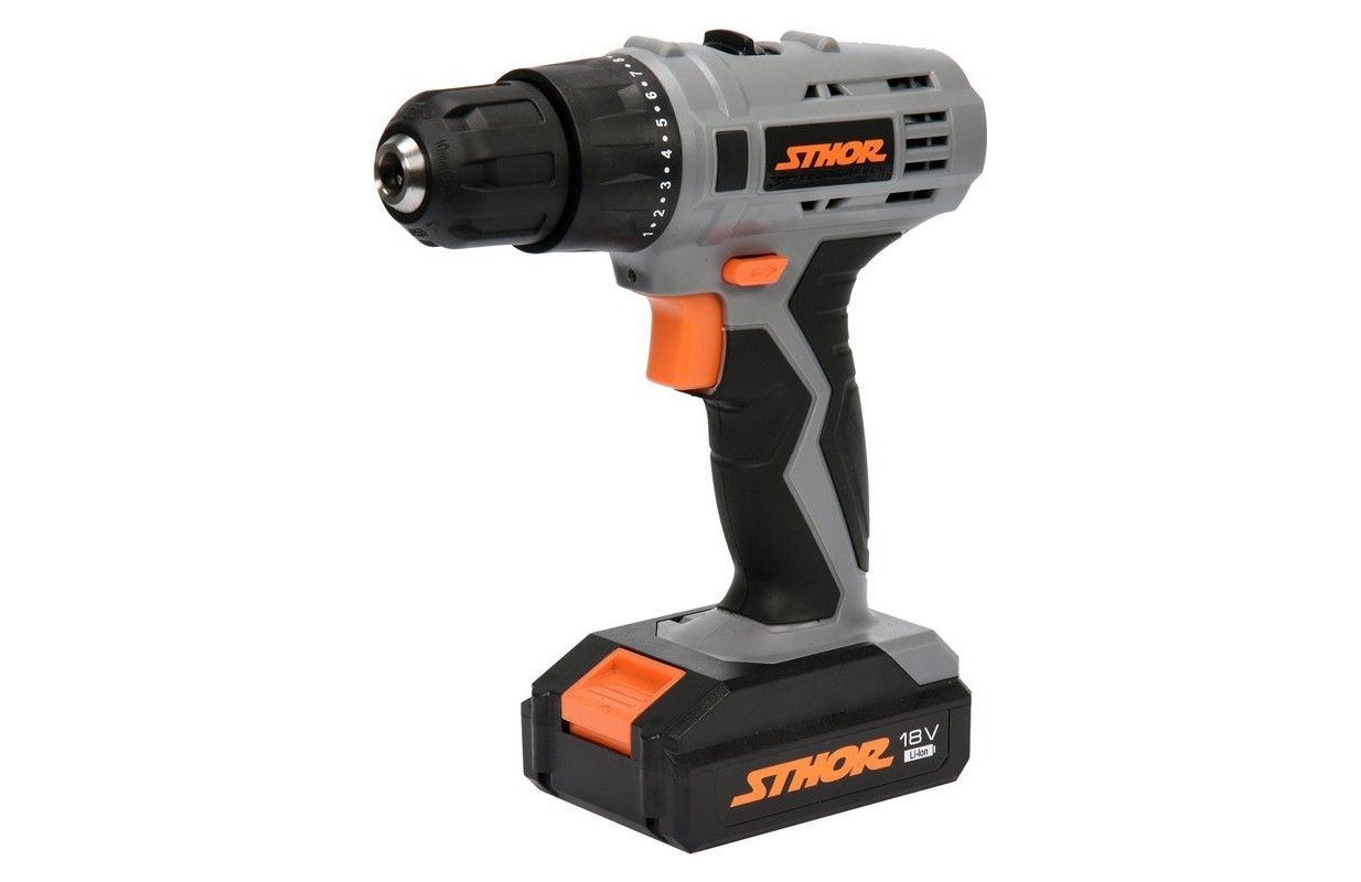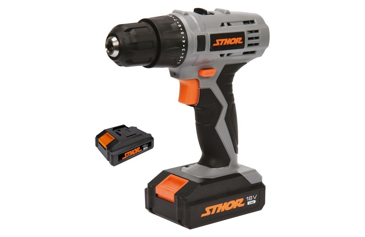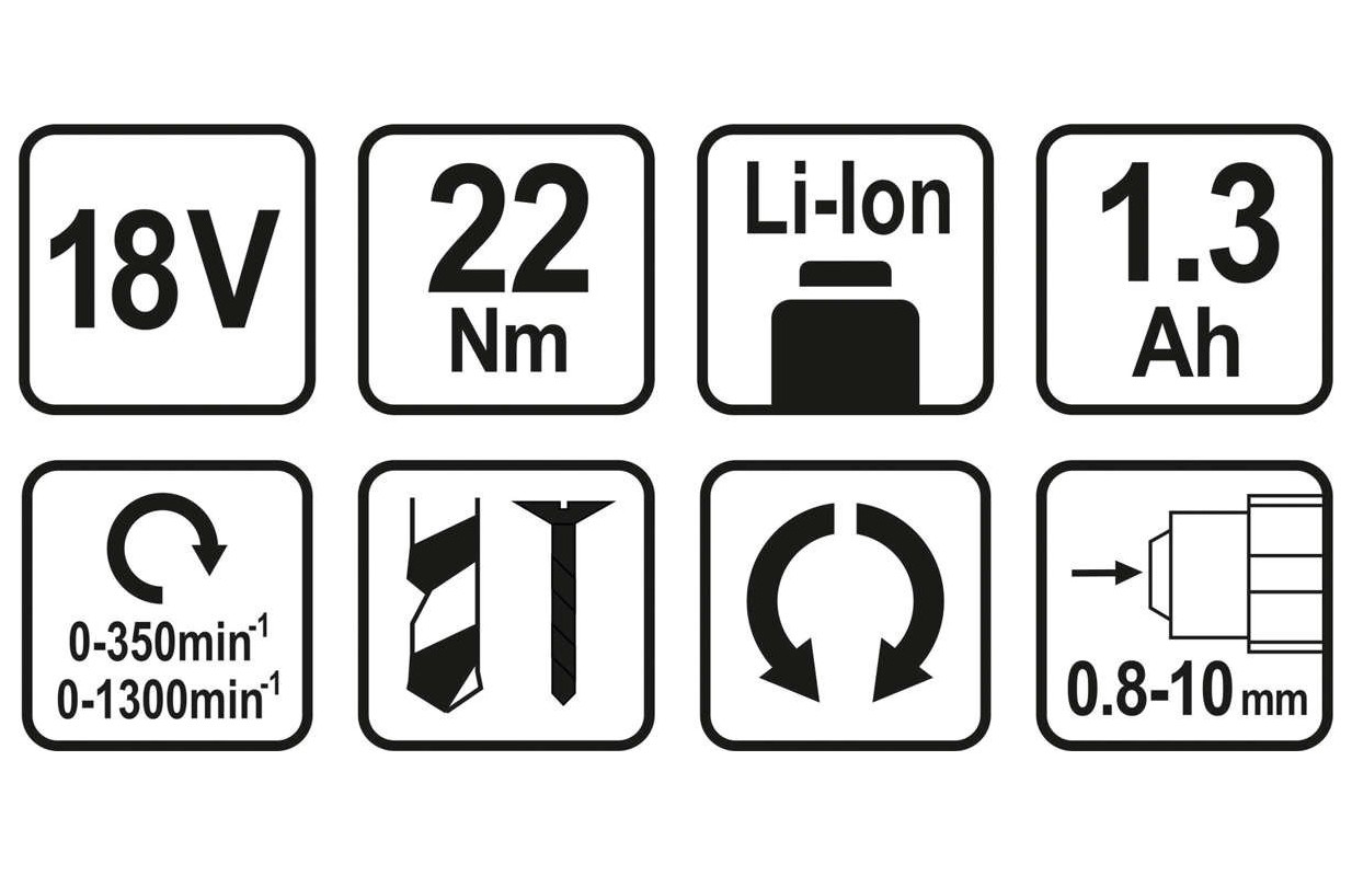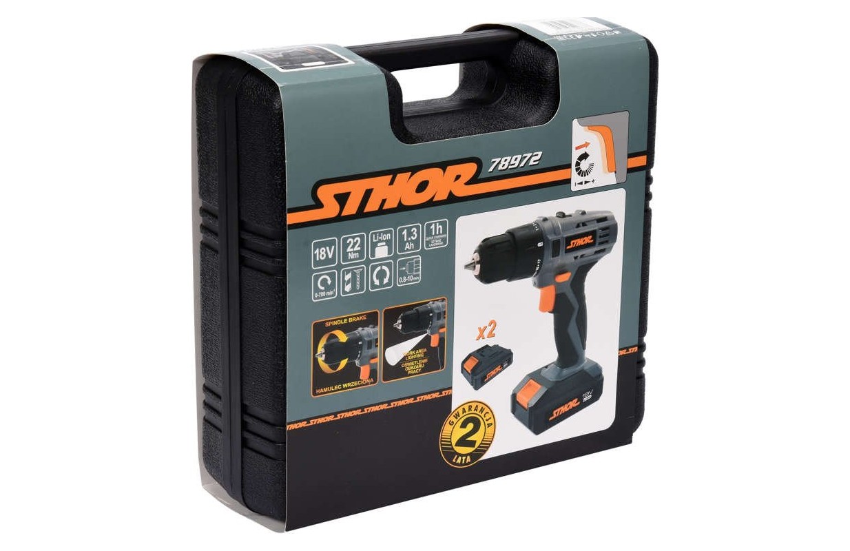Brand Sthor Entity responsible for this product in the EU Series GRF Functions screwing, drilling Max. torque 22 Nm Rotations 0-350 / 0-1300 min⁻¹ Voltage 18 V d.c. Battery type Li-Ion Battery capacity 1300 mAh Battery quantity 2 Charger included yes Charging time 3-5 h Stroke no Max. hole diameter in wood 10 mm Max. hole diameter in steel 10 mm Holder size 0.8-10 mm Toolholder type self-centering Electronic rotation adjustment yes Spindle brake no Rotation switch yes Work mode switch yes Work area lighting yes Charge level indicator no Electric insulation class III Protection grade IP20 Acoustic pressure 89.0 ± 3.0 dB(A) Acoustic power 100.0 ± 3.0 dB(A) Vibrations 2.629 ± 1.5 m/s² Weight 0.78 kg Symbol 78972