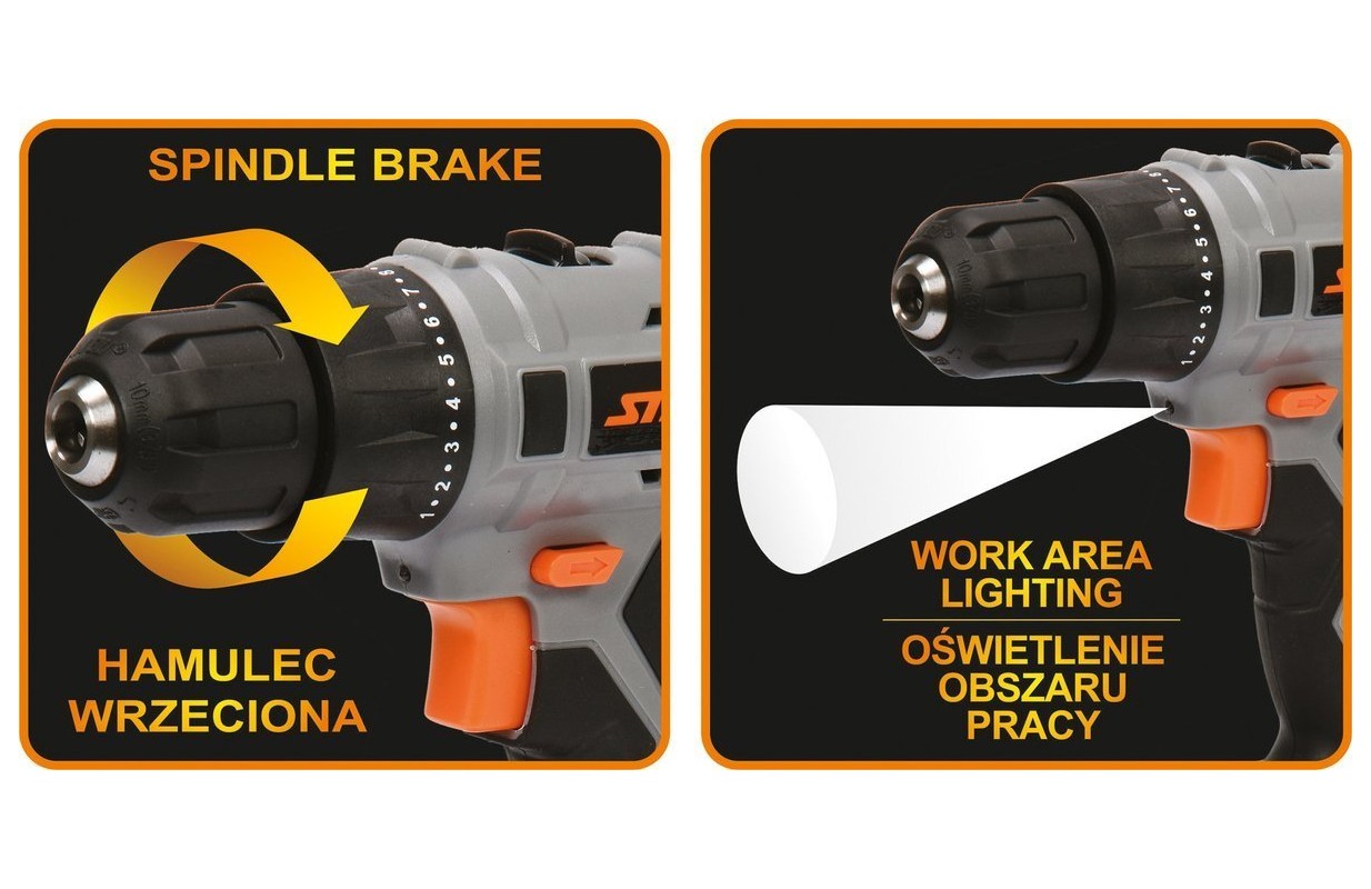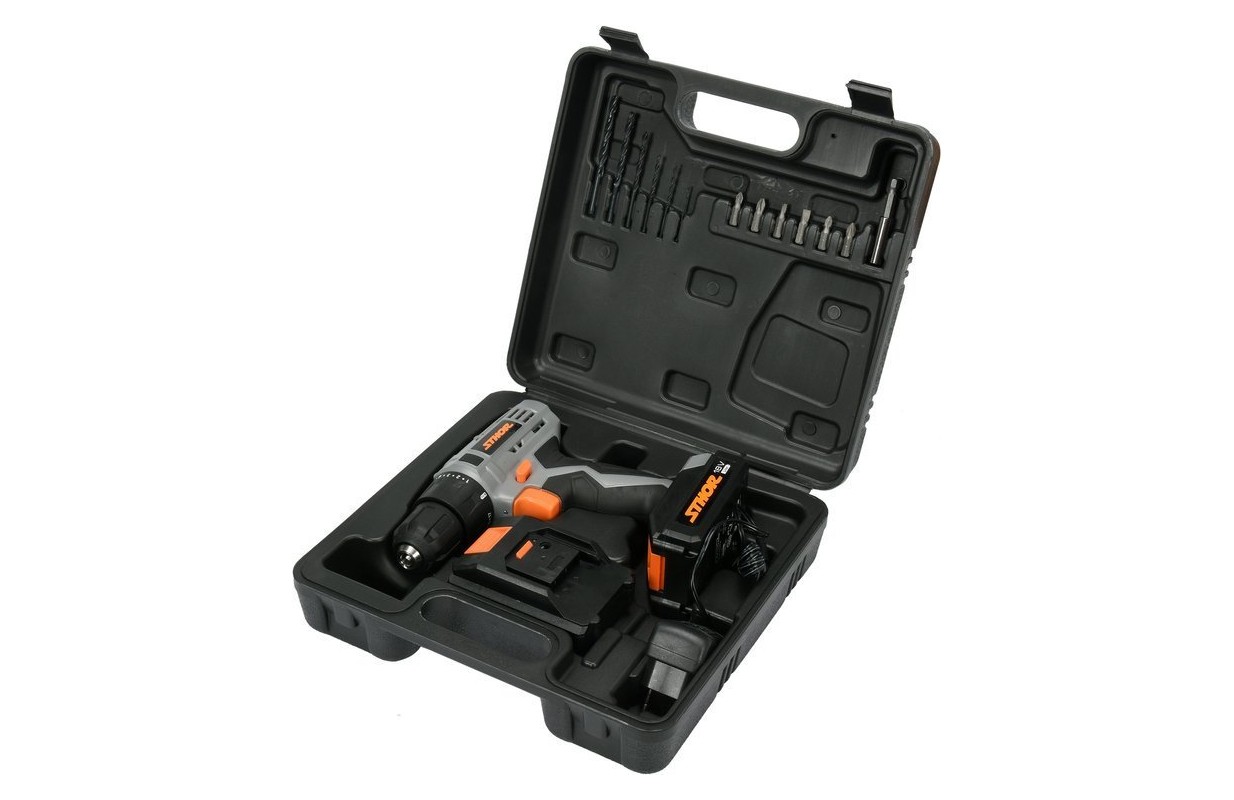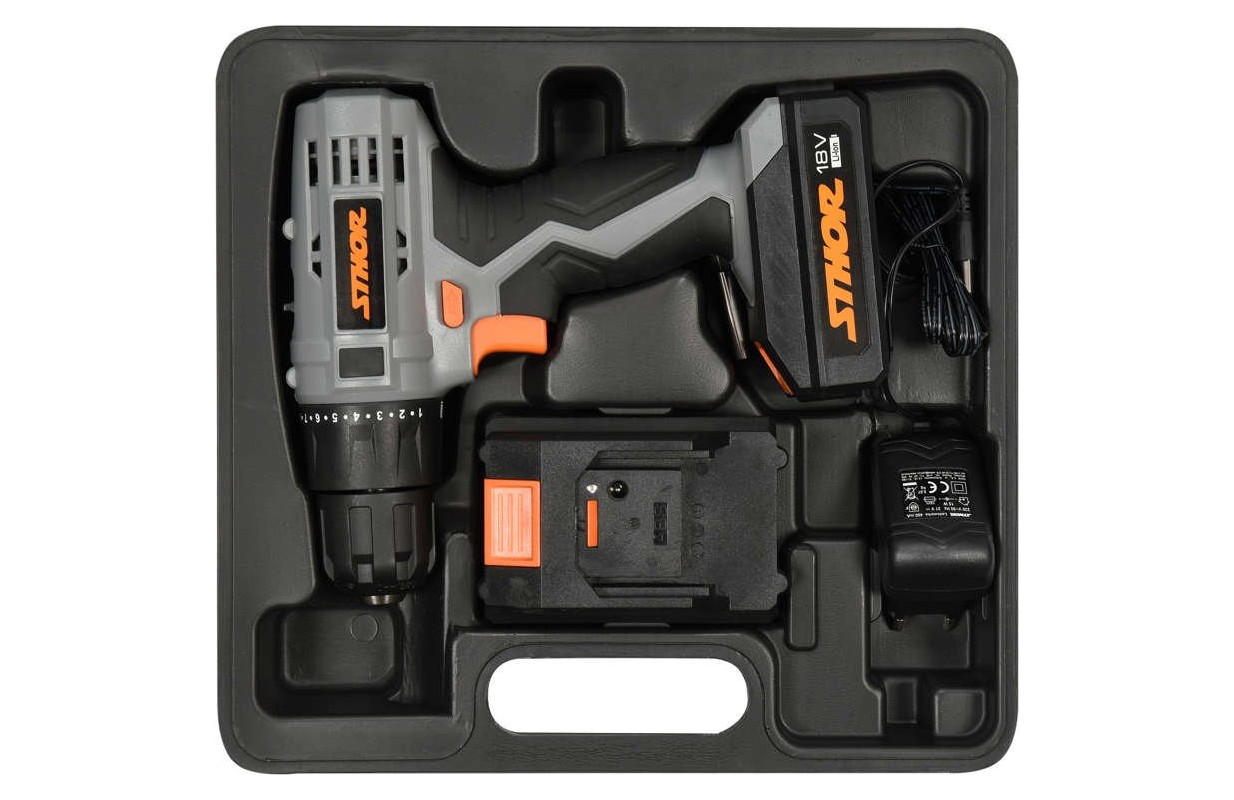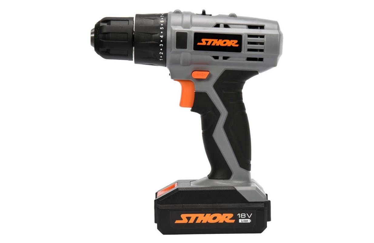 Brand Sthor Entity responsible for this product in the EU Series GRF Functions screwing, drilling Max. torque 22 Nm Rotations 0-350 / 0-1300 min⁻¹ Voltage 18 V d.c. Battery type Li-Ion Battery capacity 1300 mAh Battery quantity 2 Charger included yes Charging time 3-5 h Stroke no Max. hole diameter in wood 10 mm Max. hole diameter in steel 10 mm Holder size 0.8-10 mm Toolholder type self-centering Electronic rotation adjustment yes Spindle brake no Rotation switch yes Work mode switch yes Work area lighting yes Charge level indicator no Electric insulation class III Protection grade IP20 Acoustic pressure 89.0 ± 3.0 dB(A) Acoustic power 100.0 ± 3.0 dB(A) Vibrations 2.629 ± 1.5 m/s² Weight 0.78 kg Symbol 78972