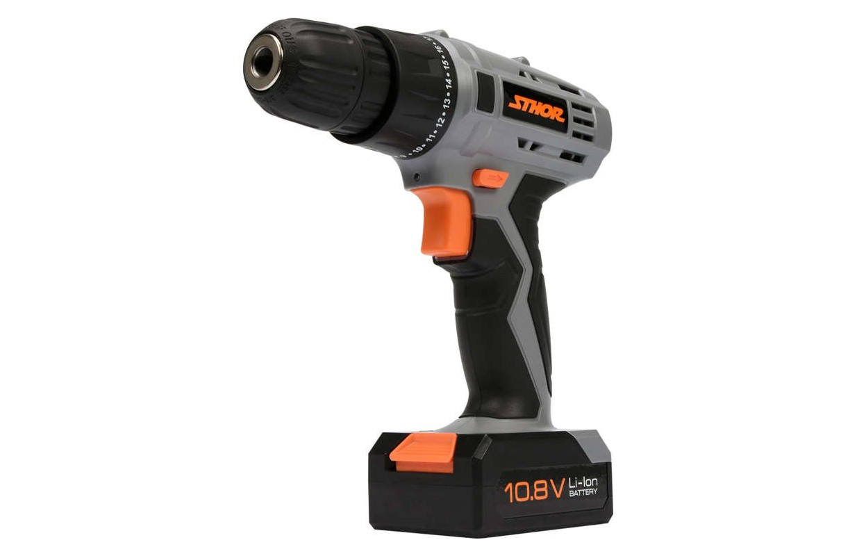 Drilling and screwdriving with variable speed control by potentiometer in the button and torque control by clutch.