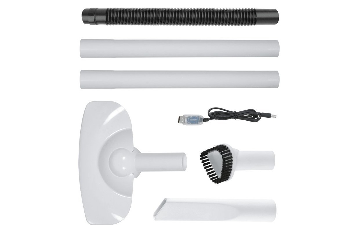 vacuum cleaner, flexible tubing, extension tube x2, scrub brush, narrow tip, upholstery nozzle, suction cup adapter, filter, fabric bag
