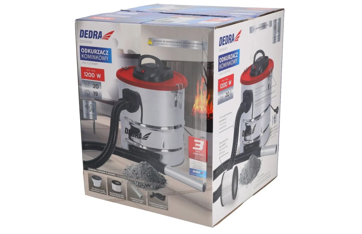 The DEDRA DED6593 fireplace vacuum cleaner is designed for cleaning ash from fireplaces, stoves, or grills.