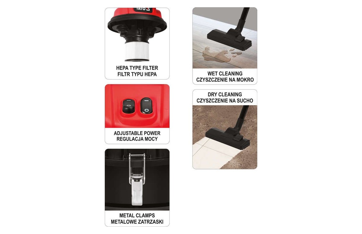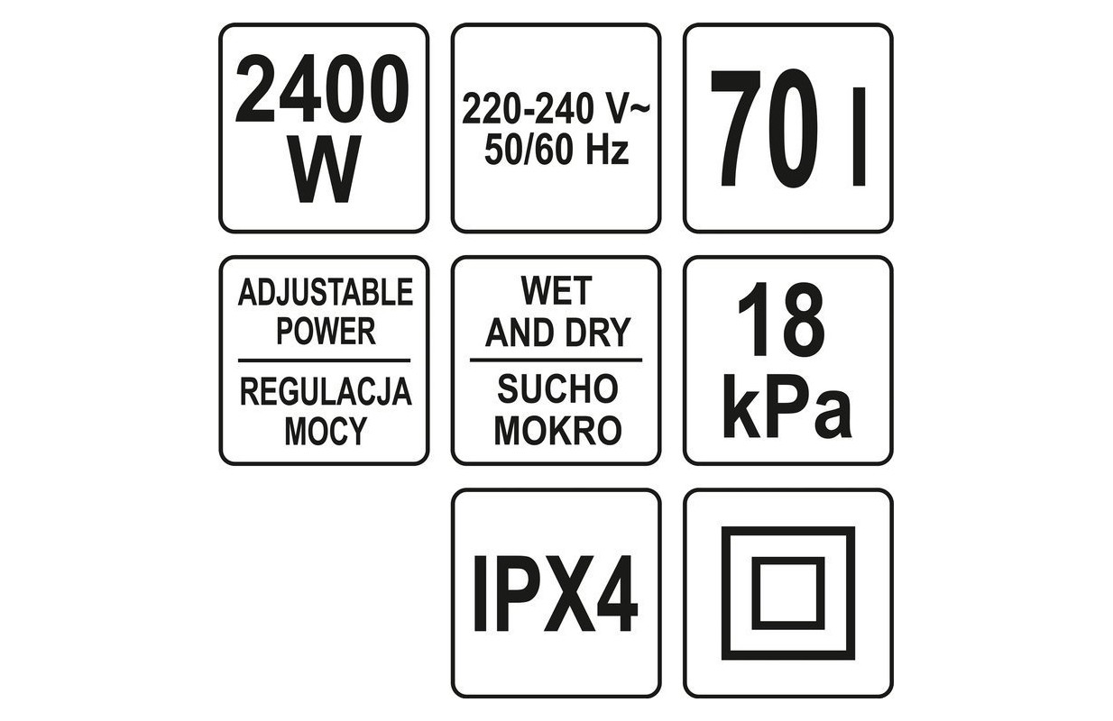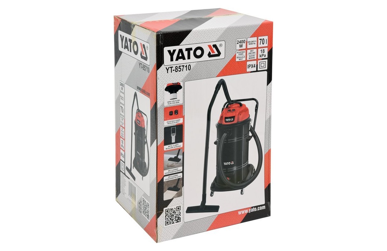 Industrial vacuum cleaner by YATO with 2400 W power and 18 kPa suction power. Equipped with a tank 70 L. The high power allows for fast and easy work on large, heavily soiled surfaces. Designed for use in hotels, offices, stores, public buildings.