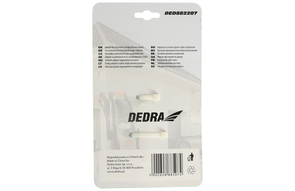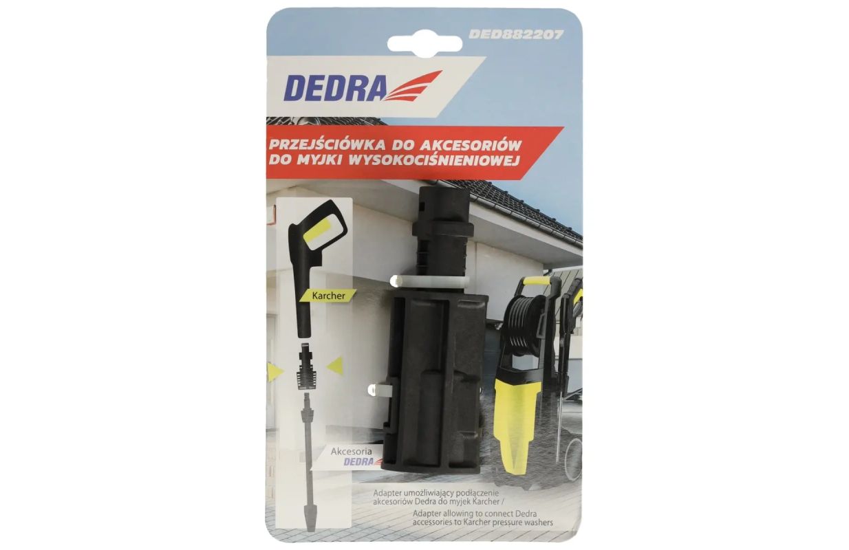 The Adapter DED882207 allows for the connection of all DEDRA high-pressure washer accessories to Karcher washers produced up to 2017.