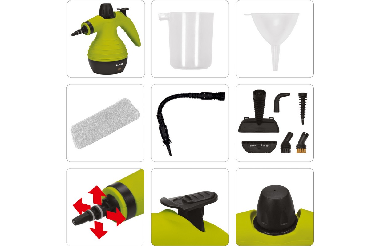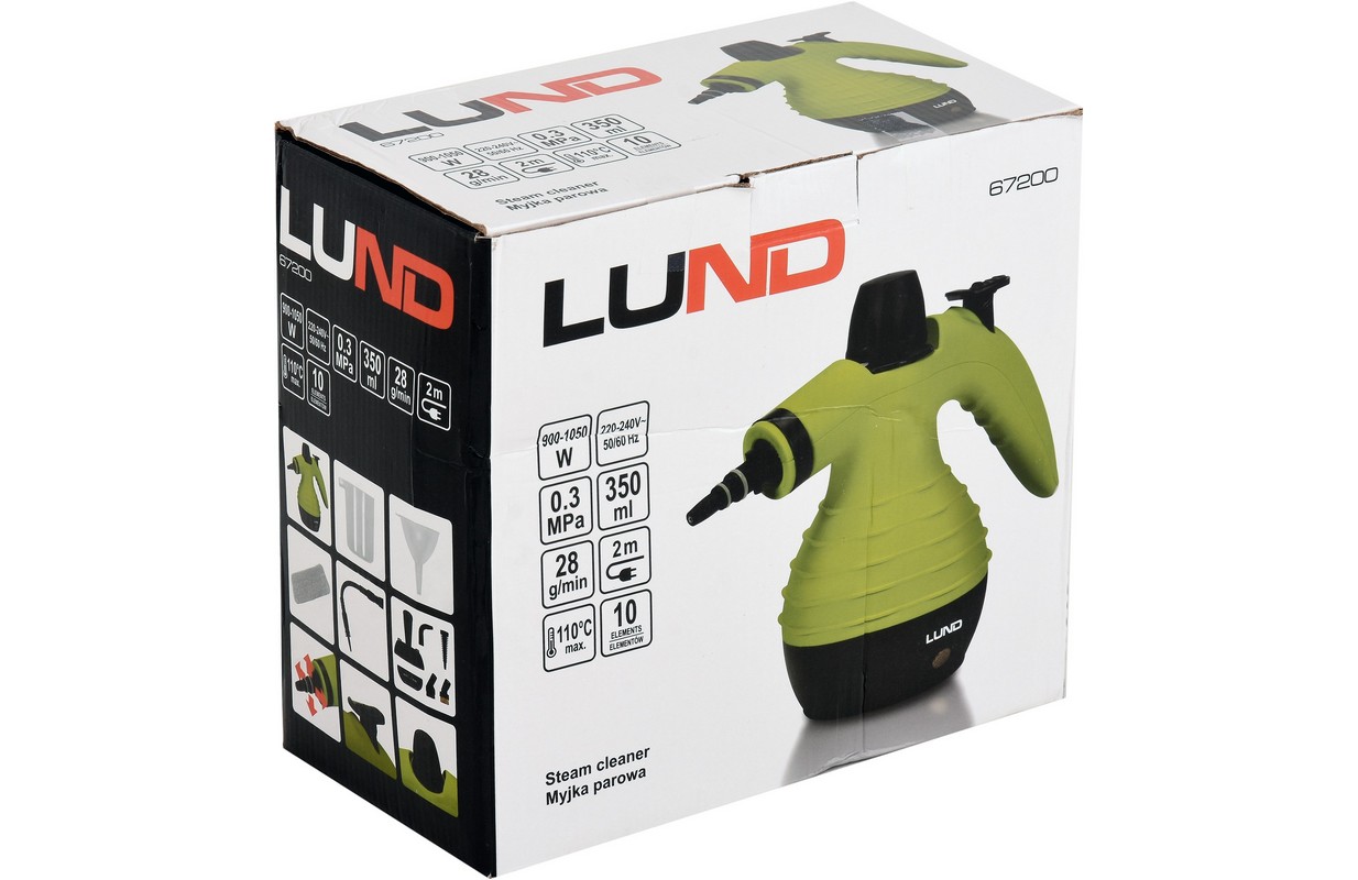 Product description Steam cleaner LUND 67200 with a set of interchangeable tips for efficient and quick cleaning of various surfaces and objects: joints, fittings, washbasins, mirrors, windows, cookers, ovens, grills, refrigerators, fabrics, toys etc.