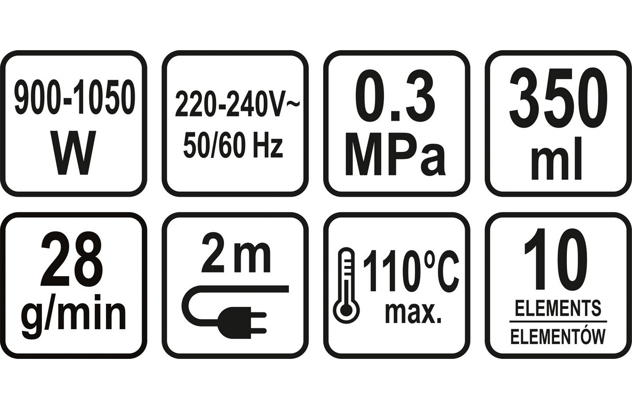 power: 900W-1050W 220-240V 50 / 60Hz water tank capacity: 350ml working time: 7-10 minutes maximum steam temperature: 110 degrees Celsius 180 degree swivel nozzle amount of steam: 28g / min pressure: 3 bar (0.3MPa) child lock cable length: 2m weight: 0.9kg 10-piece set Water resistance: IPX4 the ability to clean various types of surfaces and places: joints, fittings, mirrors, fabrics, toys, windows, stoves, ovens, grills, sinks, refrigerators and many more ACCESSORIES: