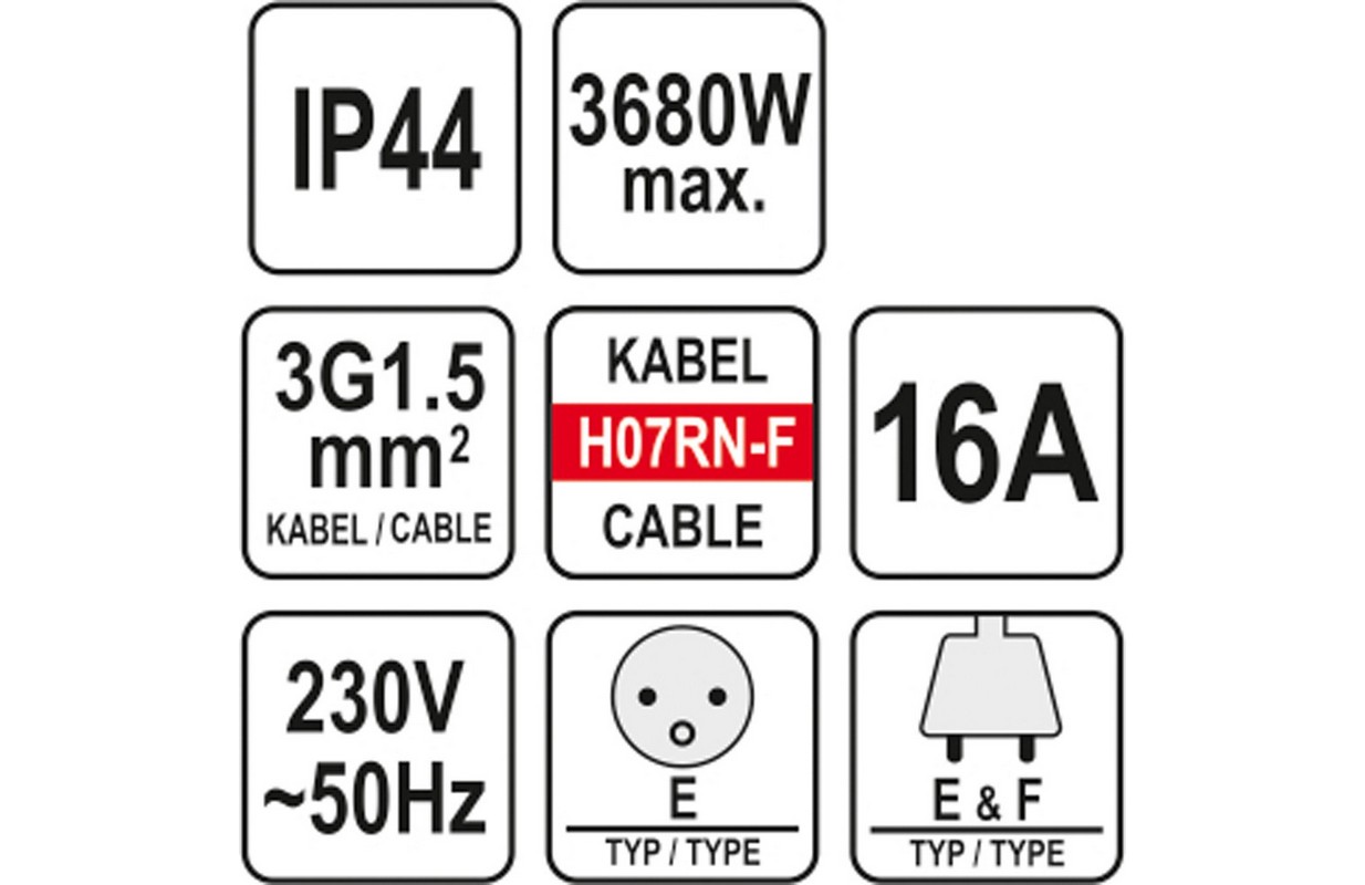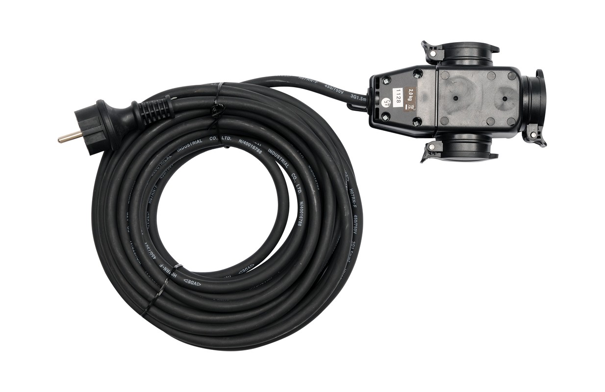 Building and workshop extension cable YT-81162 with a length of 20 meters with a distributor and 3 dust- and splash-proof sockets. The neoprene rubber sheathed cable makes the extension cord suitable for indoor as well as outdoor use, such as construction sites, gardens, yards in front of factories. The construction of the extension cord is designed for use at construction sites or workshops with power tools.