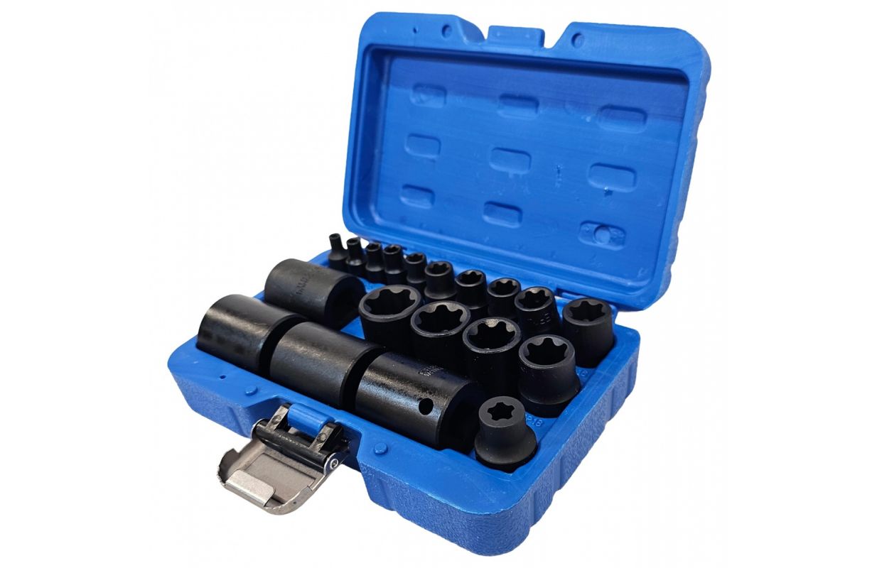 Specification: This kit includ 19pc different size external torx plus socket, 6 point EP4, EP5, EP6, EP7, EP8 with 1/4'' drive; 6 point EP10, EP11, EP12, EP14, EP16 with 3/8'' drive; 6 point EP18, EP20, EP22, EP24, EP26, EP28, EP30, EP32 with 1/2'' drive; 5 point EP8.8 with 1/2'' drive