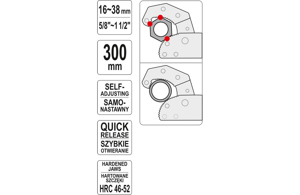 The universal 300mm long wrench, thanks to its movable gór jaw, allows for self-adjustment to the size of the component to be unscrewed.