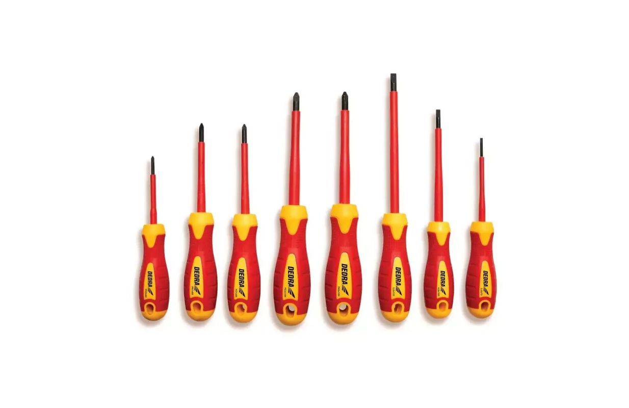 Set of 8 precision isolation screwdrivers for electrical work. The screwdrivers protect against current voltages up to 1000V. The screwdrivers are made from carbon steel, which ensures durability. The comfortable rubber handle provides the user with a good grip during use. In addition, the screwdrivers have magnetic tips, which makes screwdriving and unscrewing much easier.