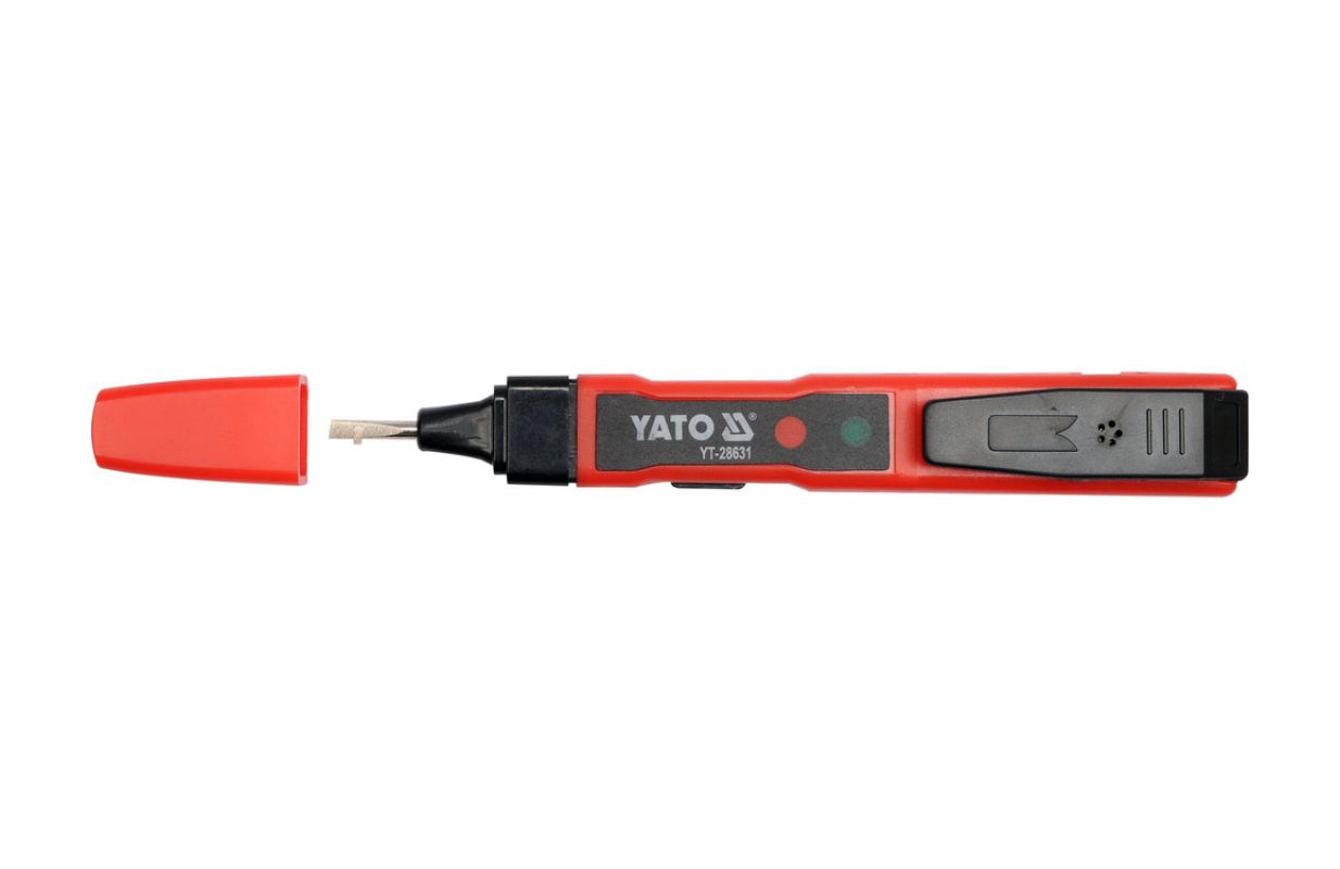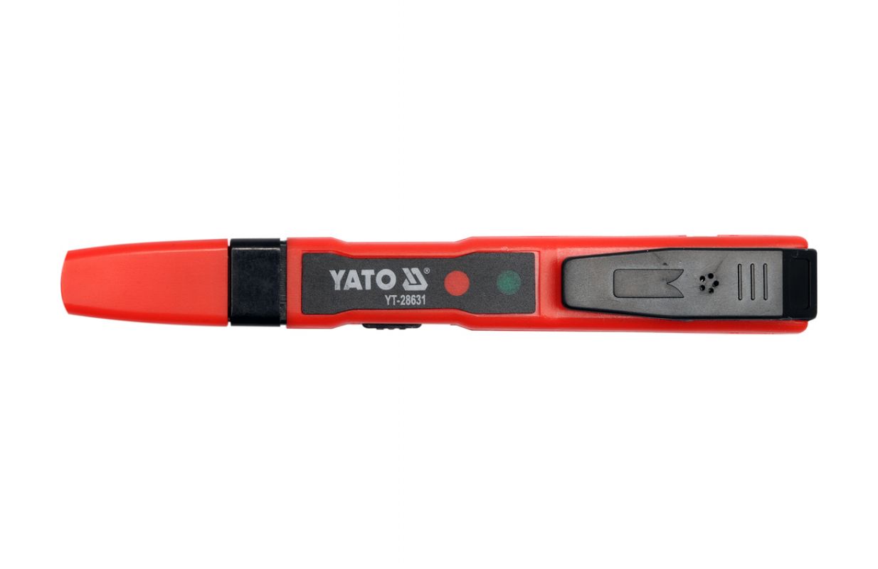 YT-28631 The voltmeter is a universal tester that, among other things, can function as a traditional tester as well as a wireless voltage indicator. It allows you to determine the presence of electrical voltage, measure alternating voltage, for example, behind plaster, as well as conduct a continuity test of wires and check the condition of a battery or rechargeable battery. The presence of voltage is indicated by the illumination of one of the LEDs located in the tester's housing.