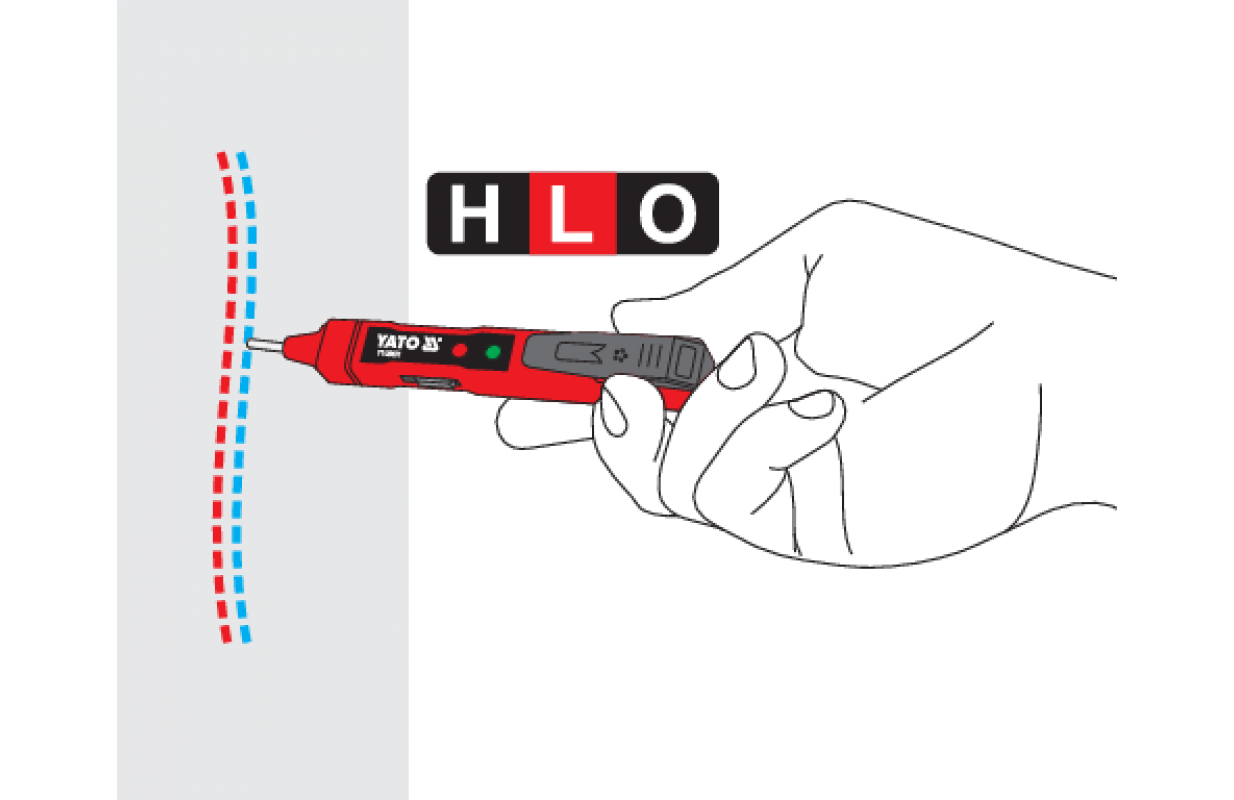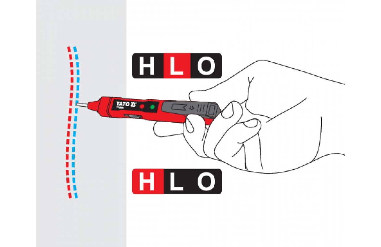 Allows for non-contact determination of alternating voltage even behind plaster. For example, to check if there is voltage in an insulated cable, set the tester to position [L]. Then, holding the blade, bring the metal contact from the top of the handle close to the insulated wire. The green LED will light up, and an audible signal will sound, indicating the presence of voltage in the tested wire. The sensitivity of the method can be increased by switching the button from [L] to [H]. This method also allows for "non-contact" detection of a break in an electrical wire that is under voltage. At the break point, the tester will stop signaling the presence of voltage. It is also possible to change the operation of the tester and search for voltage using the end of the main probe. However, when searching for wires behind plaster, care should be taken not to damage the wall.