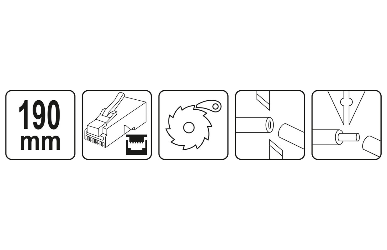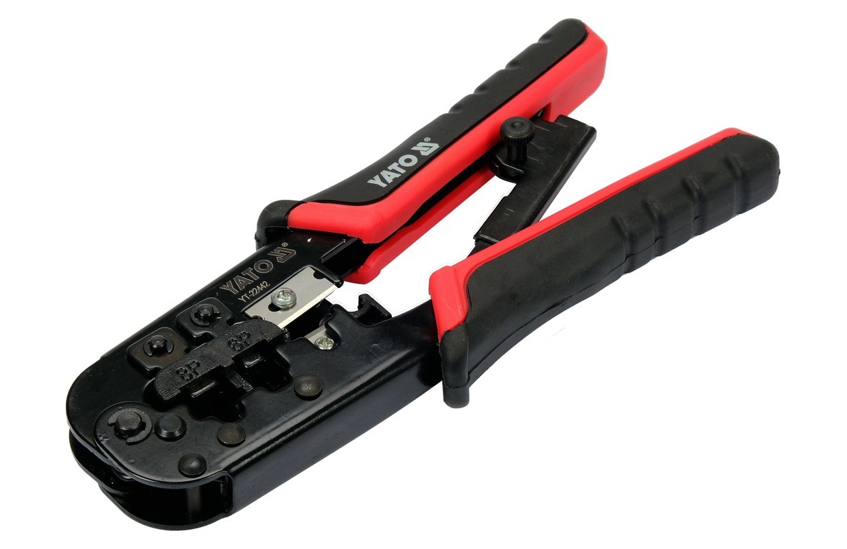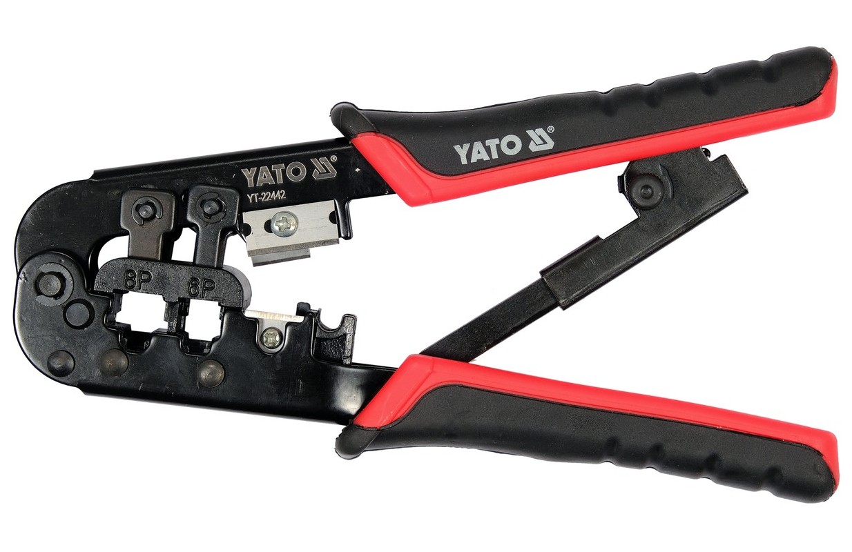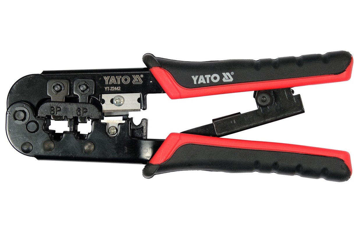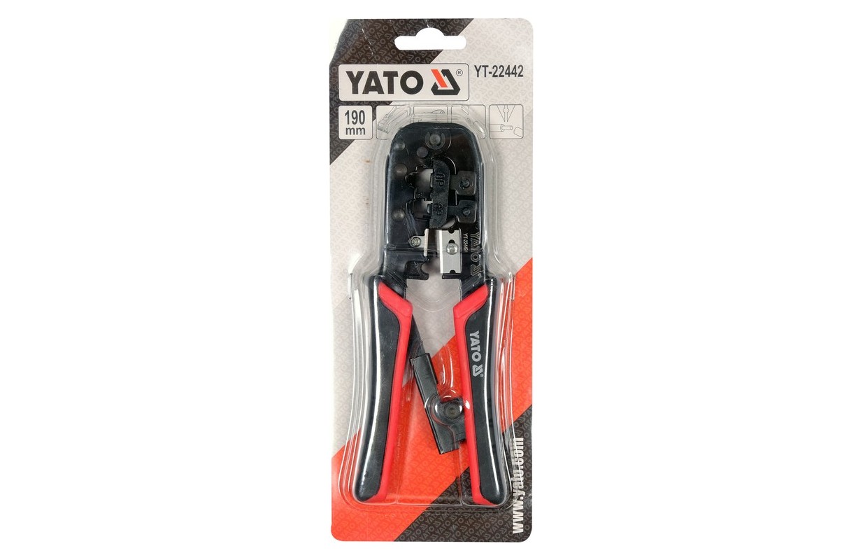 PinchesYT-22442 with ratchet mechanism for crimping telephone and network terminals. The pliers are made of carbon steel subjected to an oxidation process thatóry protects against corrosion. Two-component plastic handle caps. The harder PP component firmly adheres to the body, while the TPR outer part is pleasant to the touch and has anti-slip properties