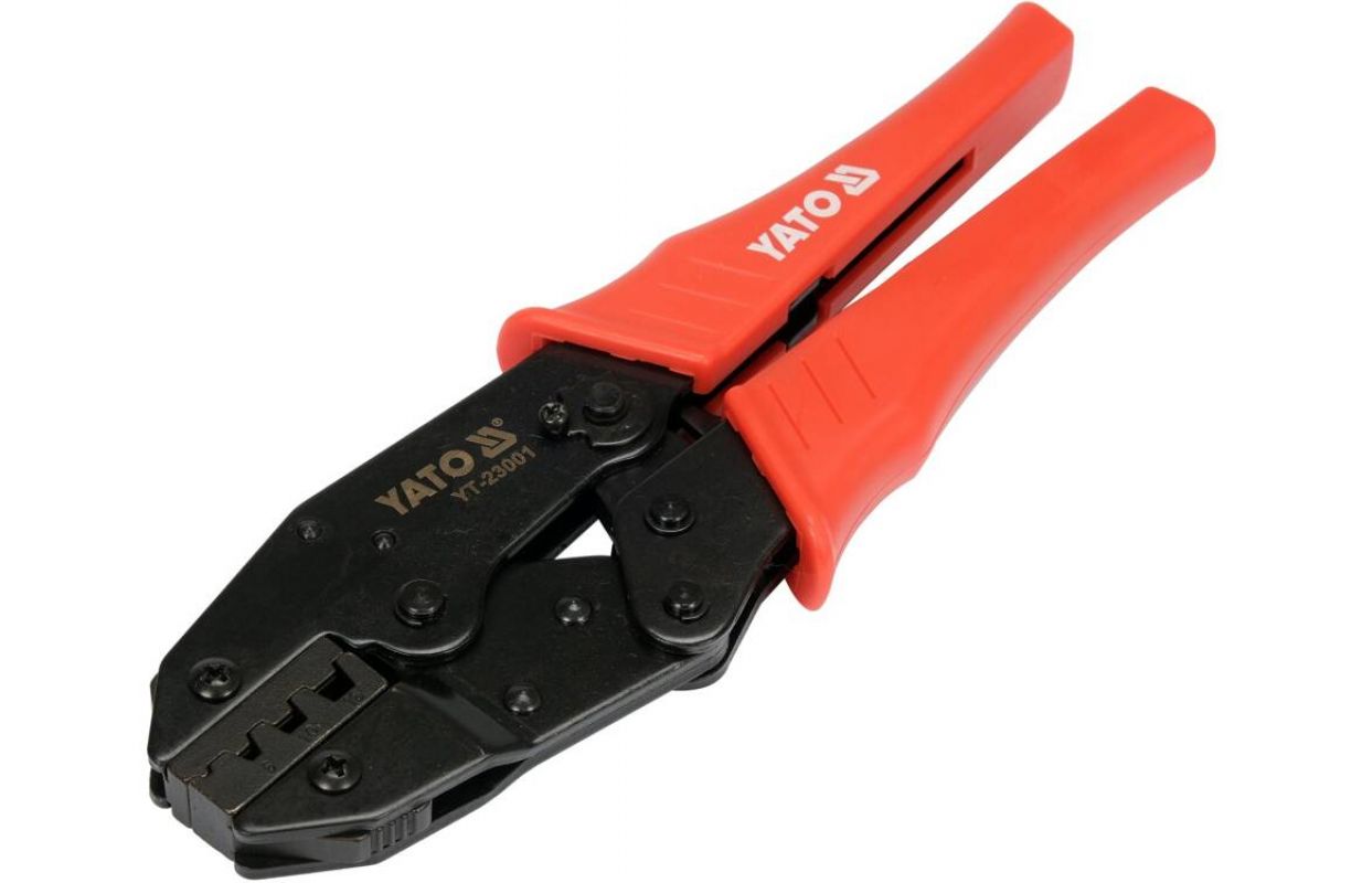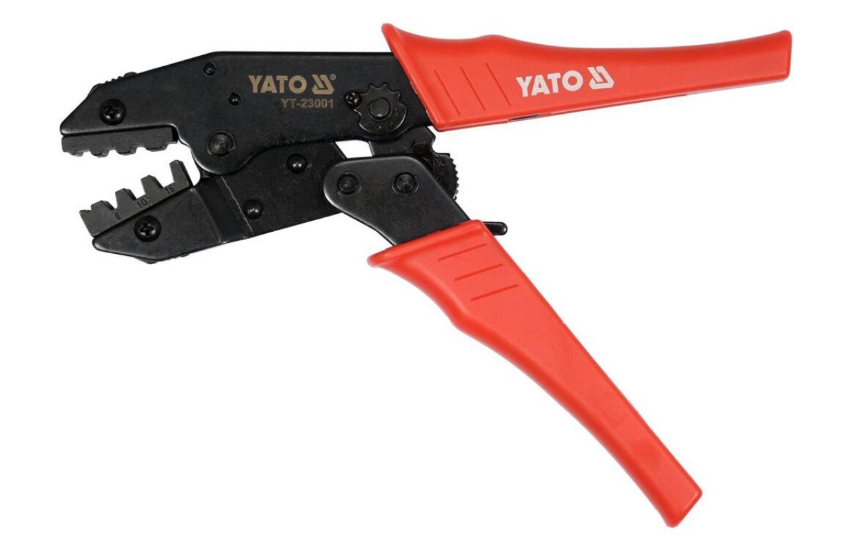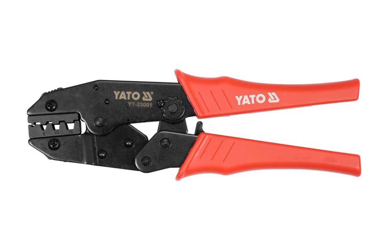 Pliers with ratchet mechanism with adjustable clamping force. The pliers are designed for crimping sleeve connectors for 6.0mm2, 10mm2 and 16mm2cables. The blackened surface protects against corrosion. The contoured handle pads are made of durable polypropylene. The ratchet mechanism allows quick and precise clamping without excessive force.