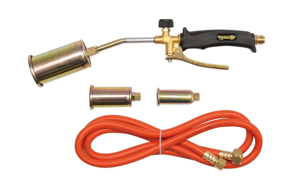 Basic set of short roofing burners 73340 designed for typical heat-sealed membrane installation work. Includes handle with valve lever labor saving, hose with connections to the cylinder and handle, and three flame nozzles for intense heating or tanning.