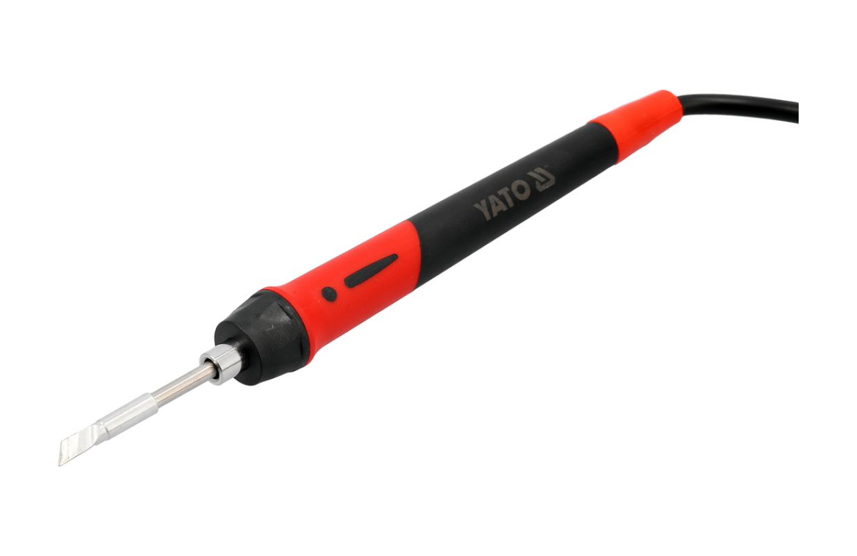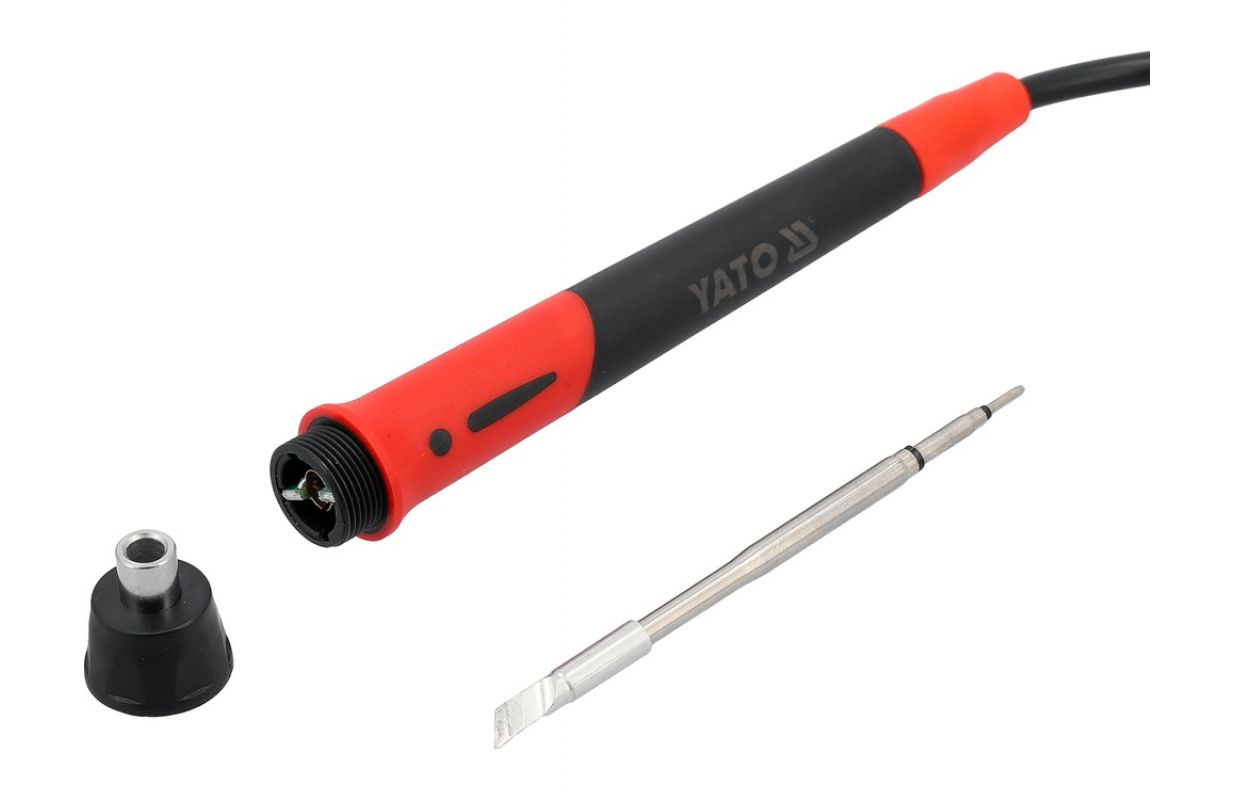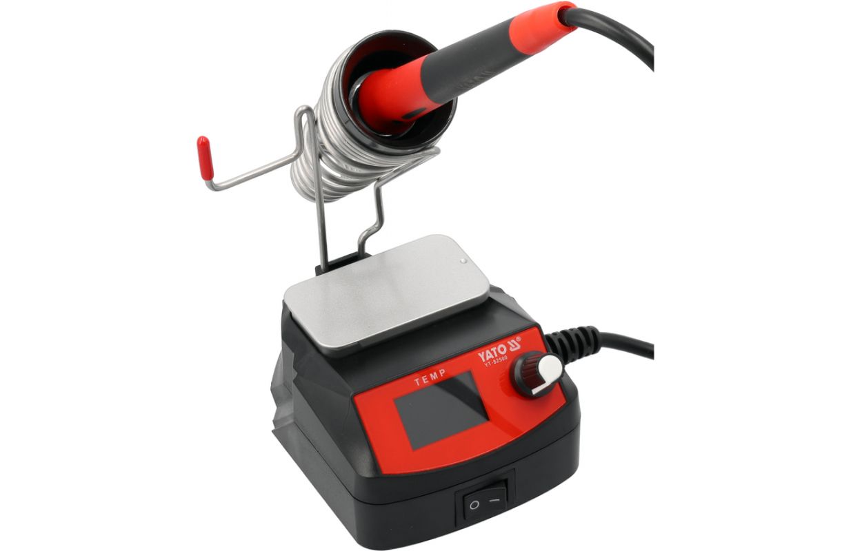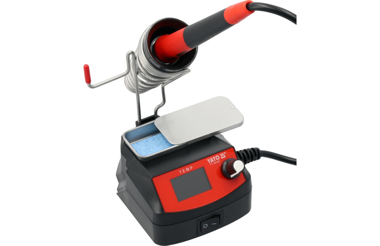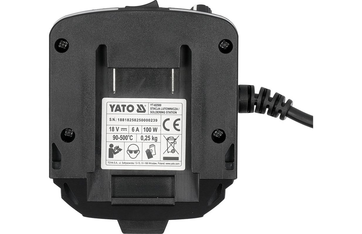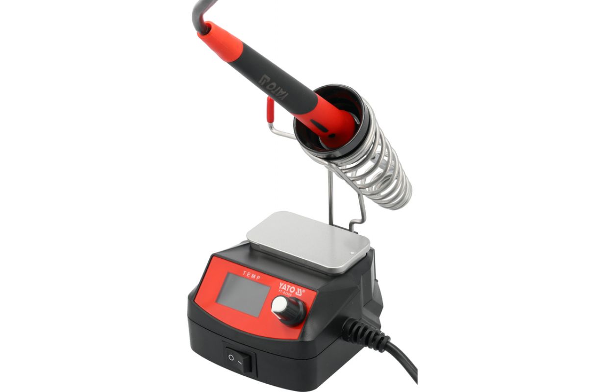 Soldering station for 245 tips designed for mobile work. The device is powered by batteries from the YATO 18 V system, allowing it to operate in locations where access to mains power is limited. The color display enables convenient monitoring of parameters, while temperature adjustment and calibration allow settings to be tailored to the type of components being soldered.