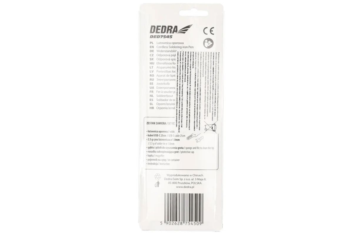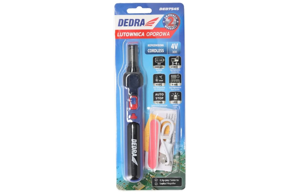 Wireless resistance soldering iron model DED7545 is a tool with which we can join wires, cables or solder integrated circuits using solder. The tool can be used both in the home garage and by professional electronics engineersand electricians. Rechargeable via USB.