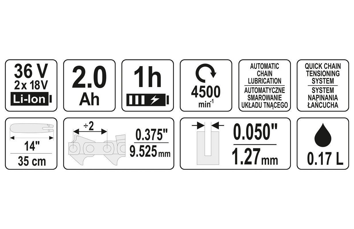 Chainsaw 36v, guide bar 14'', 8.5 m/s - 2x battery 2 ah (YT-82812)
