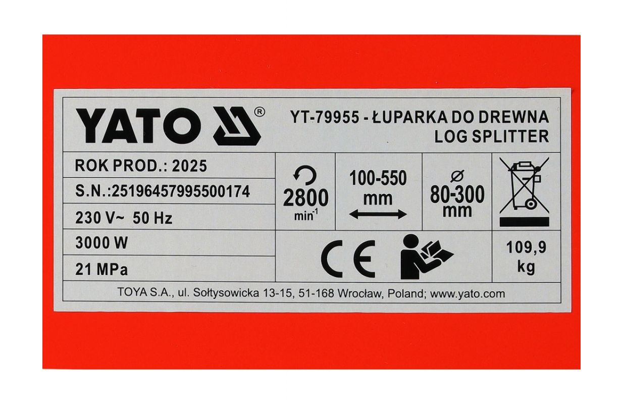 An efficient and powerful hydraulic log splitter designed for regular fuel preparation at home and for semi-professional use. The vertical design facilitates handling large logs without the need to lift them to working height. A pressure force of 8 tons combined with a 3000 W motor ensures quick splitting of firewood and fuel for boilers, reducing the physical effort required by the operator and shortening the time needed to prepare supplies for the season. The device processes wood up to 550 mm long and 300 mm in diameter.