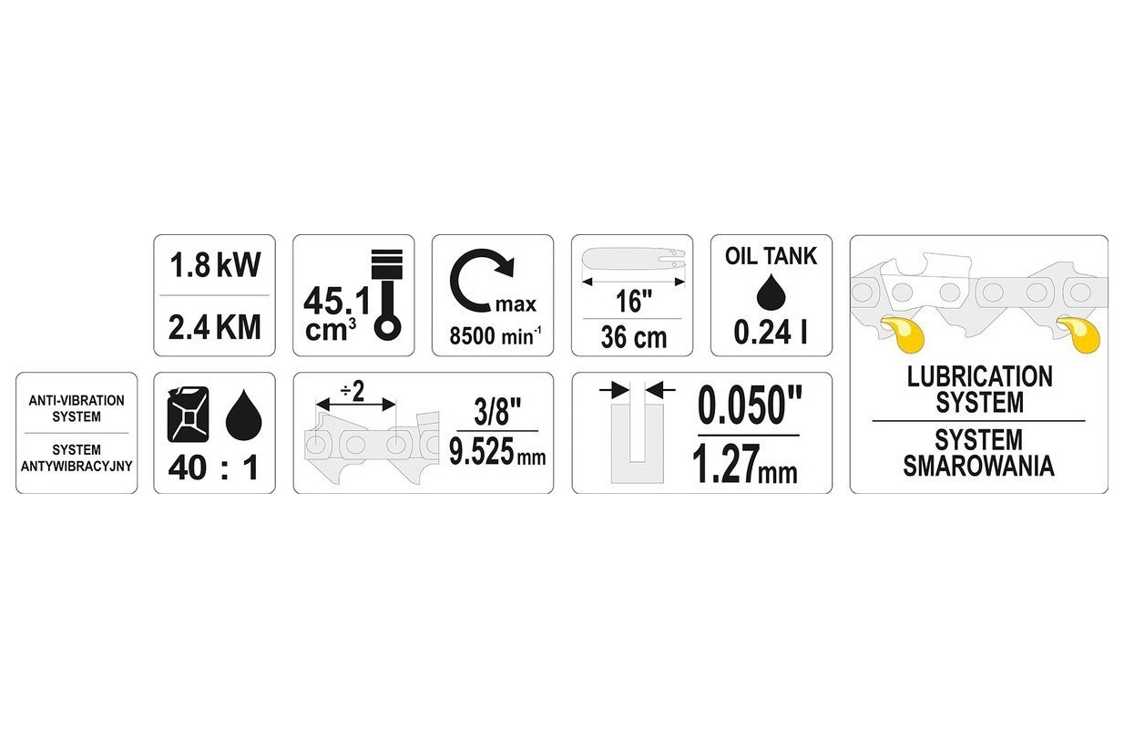 The YATO petrol saw has a automatic lubrication system, as well as a fuel venting system. All of this makes the tool very easy and undemanding to operate.