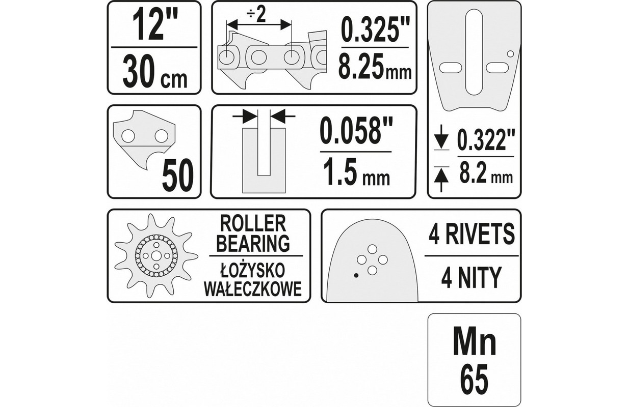 Length 12", 50 links, pitch 0.325", width 0.058" (1.5 mm).