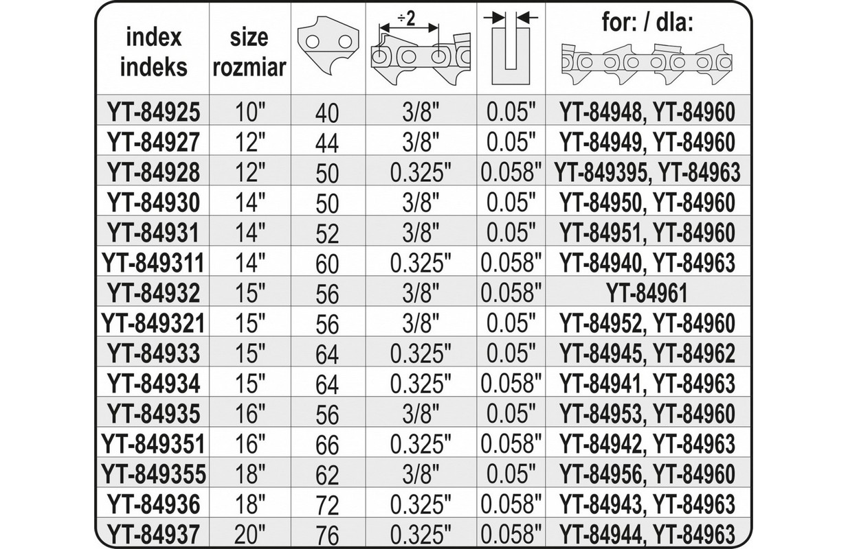 The YATO guides are designed for home and professional use. They are dedicated to work aroundó3 the house, in the garden. They are also successfully suitable for tree felling work. It is suggested to use the guides with chains YATO YT-849395 or YT-84963. It is also possible to use them with chains from other manufacturersós.