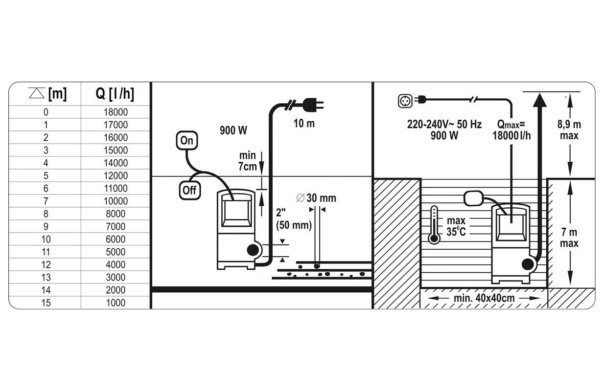 very good performance: flow rate for a 900 W pump = 18 m3/h (with the head as in any pump the flow rate decreases)