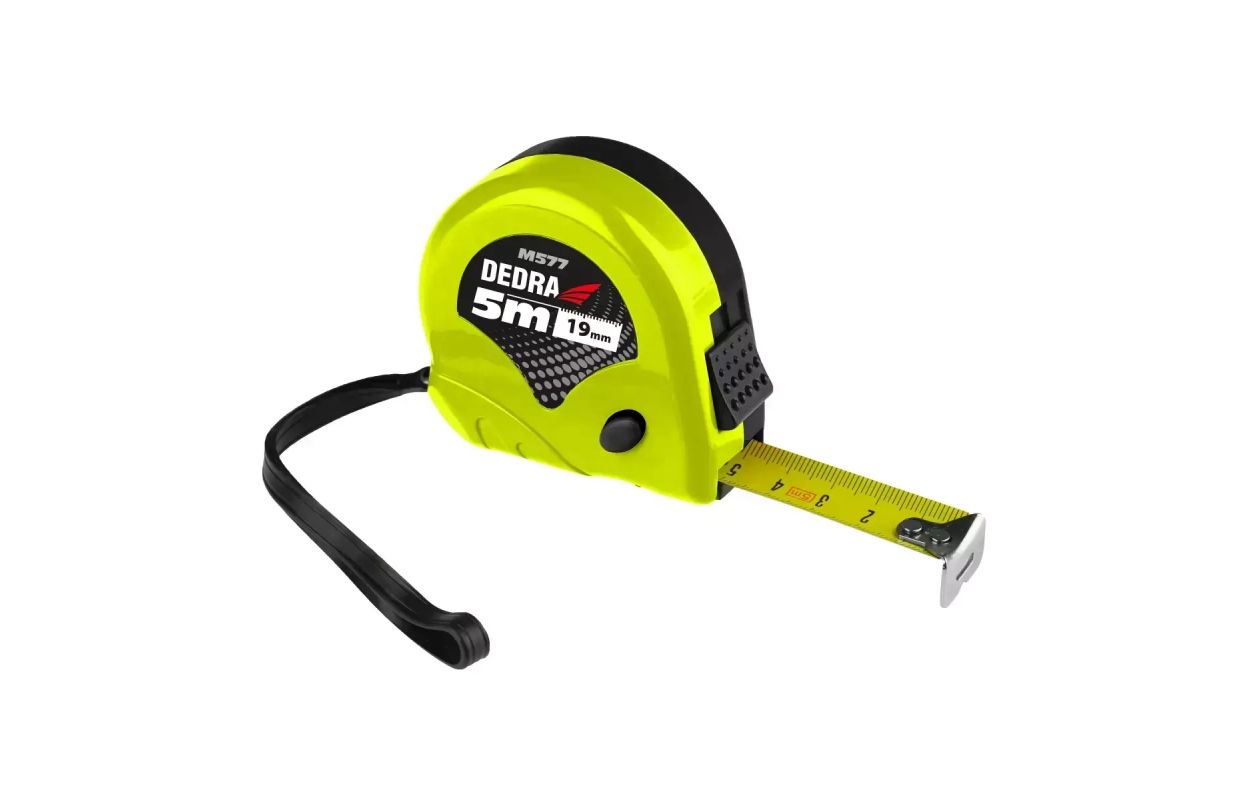 Measuring tape measure. Useful at home, in the garage or on the construction site. The housing is made of lightweight and robust plastic. The housing is equipped with a button and a practical belt clip. The measure is made of steel. The housing has two auto-locking buttons for user convenience.