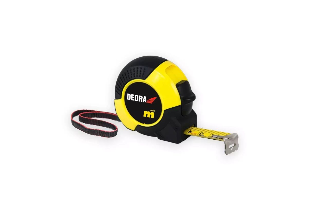 Measuring tape measure. Useful at home, in the garage or on the building site. The housing is made of lightweight and durable plastic, additionally coated with rubber. The housing is equipped with an auto-locking button and a practical belt clip. The steel measuring tape is additionally covered with nylon, which protects it from corrosion.