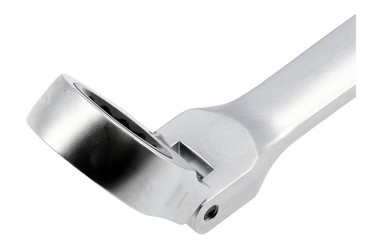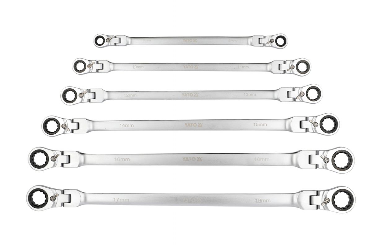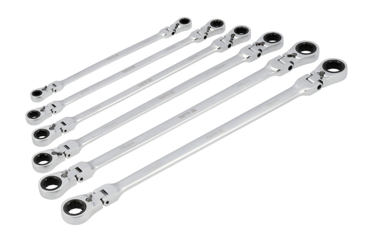 Set of long ratchet combination wrenches with a joint designed for servicing screw connections that require both high torque and access at various angles. The elongated body increases the lever arm, making it easier to loosen tightly fastened components, while the pivoting head allows the wrench to be positioned conveniently relative to the screw or nut. The 90-tooth ratchet mechanism provides a small working angle and enables smooth tightening or loosening without the need to remove the wrench from the fastener.