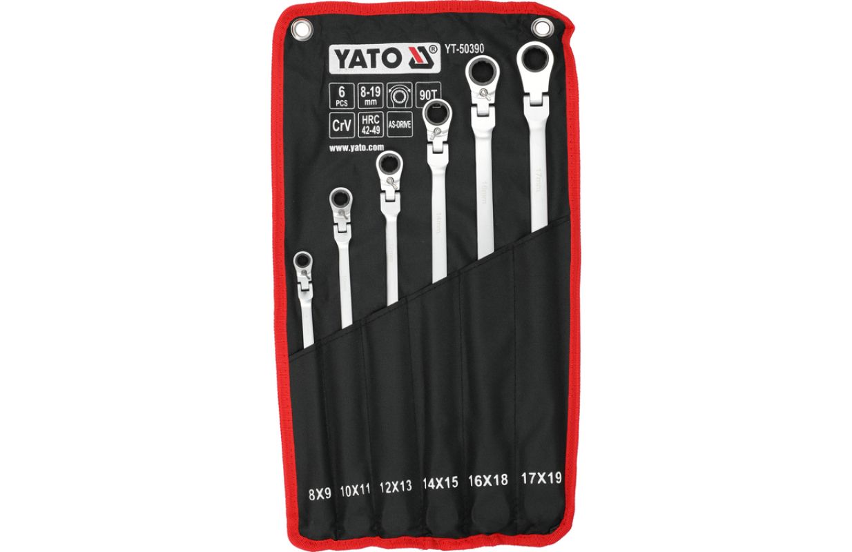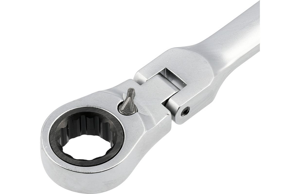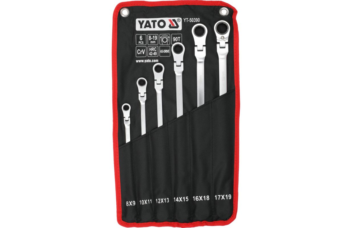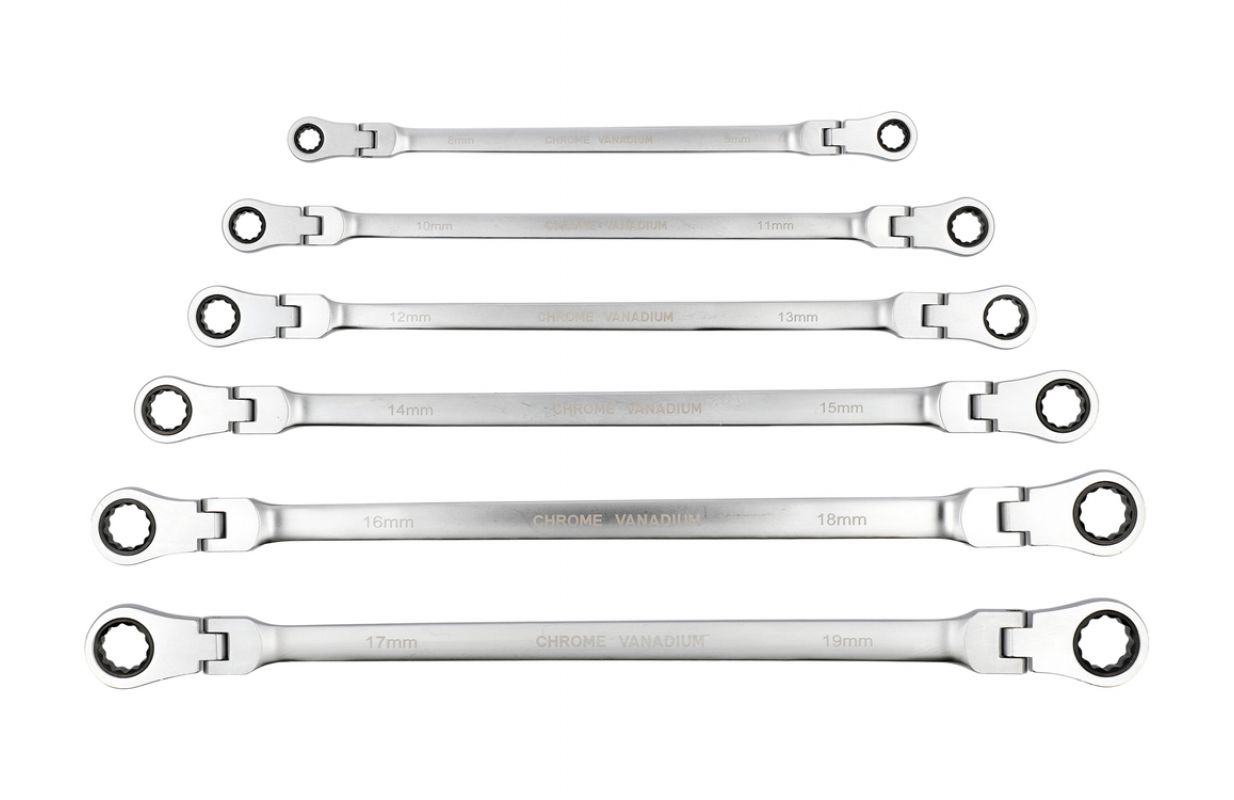 Set of long ratchet combination wrenches with a joint designed for servicing screw connections that require both high torque and access at various angles. The elongated body increases the lever arm, making it easier to loosen tightly fastened components, while the pivoting head allows the wrench to be positioned conveniently relative to the screw or nut. The 90-tooth ratchet mechanism provides a small working angle and enables smooth tightening or loosening without the need to remove the wrench from the fastener.