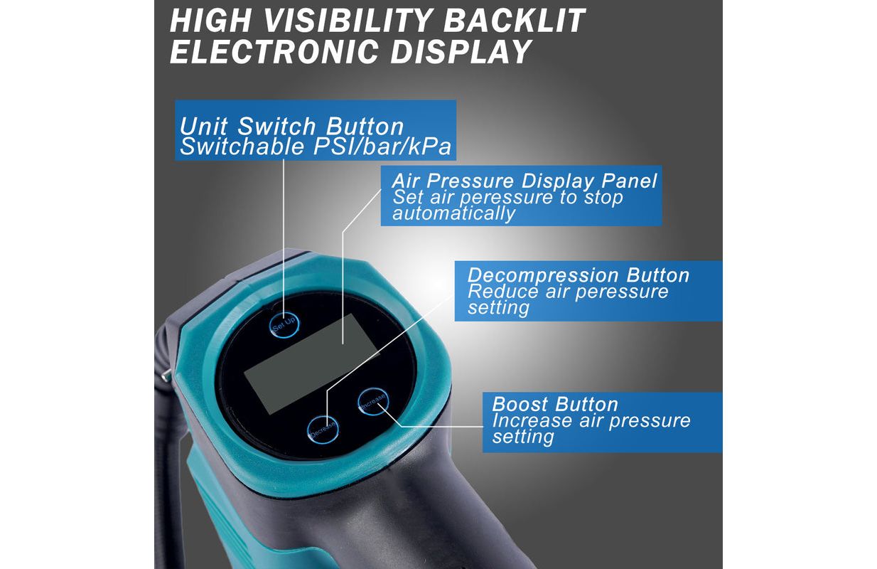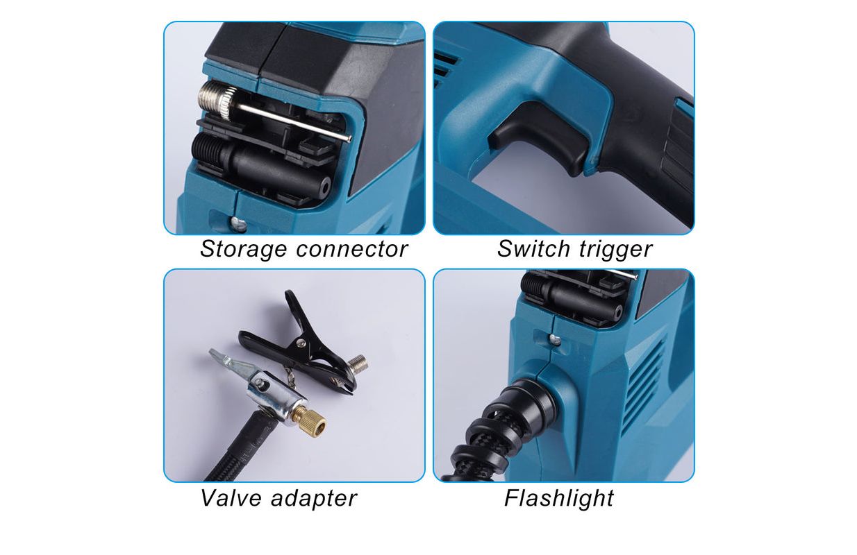 ● Intelligent digital display, full stop immediately, no need to watch, when the tire pressure reaches a predetermined value automatically stop inflating, eliminate overcharging hidden trouble