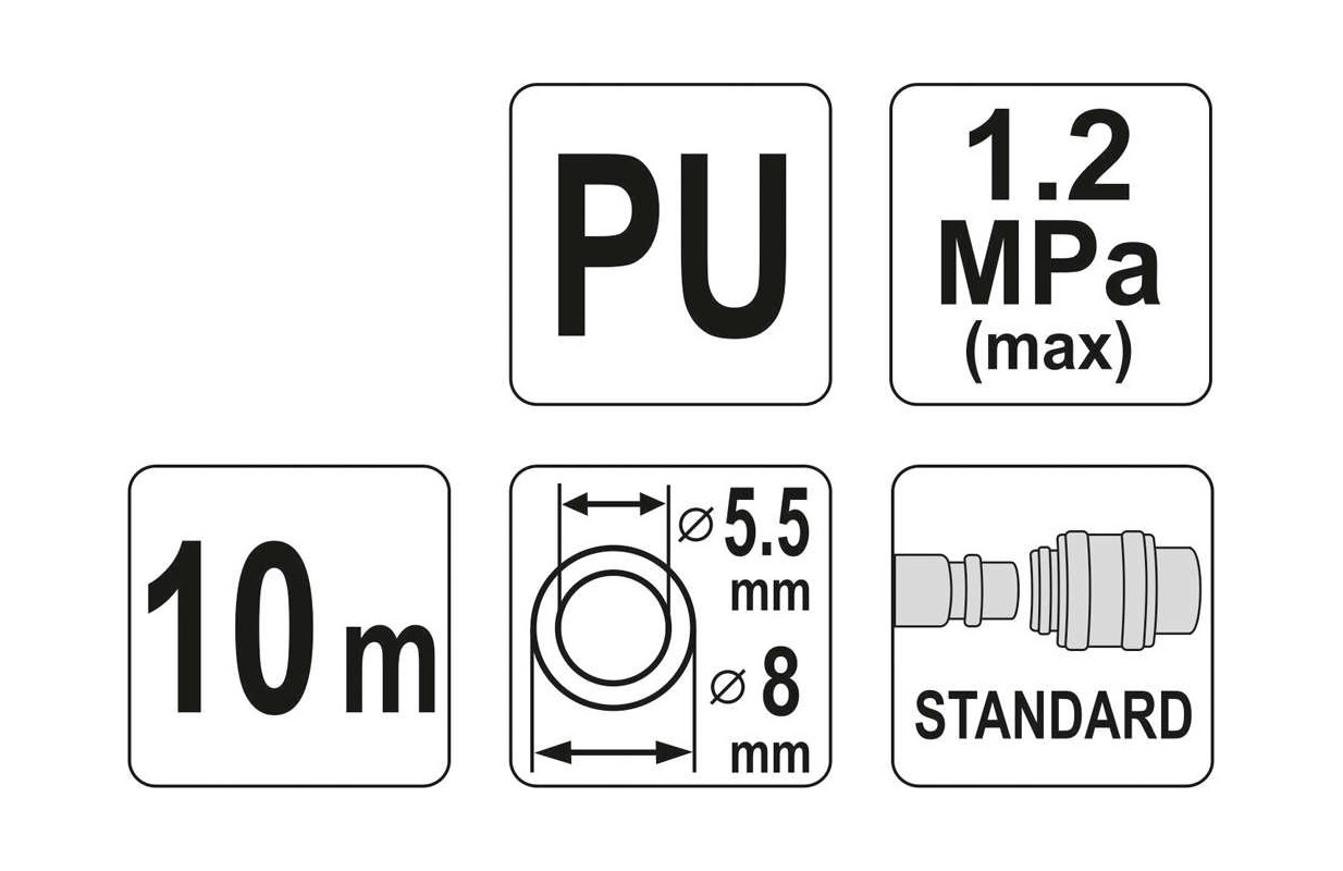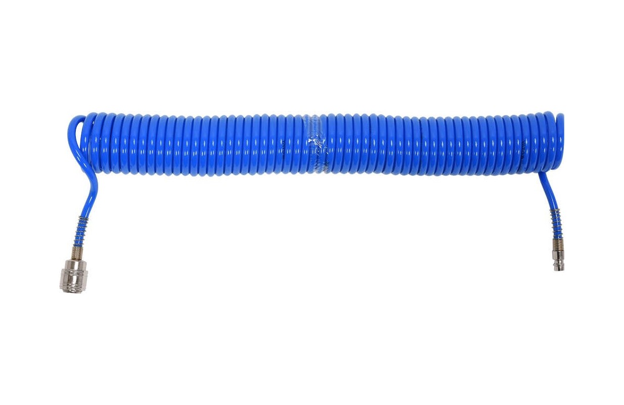 Professional spiral pneumatic hose terminated with quick disconnects. The hose is 5.5x8 mm with a length of 10 meters made of resistant polyurethane. The hose is resistant to low and high temperatures, so it can also be used outside the workshop.