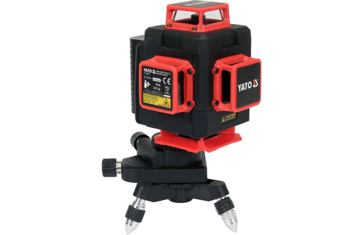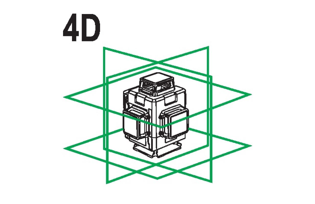 Self-leveling 4D four-plane laser with green beam. Casts 16 lines, four per plane. It allows you to get level and vertical on any wall simultaneously in real time.