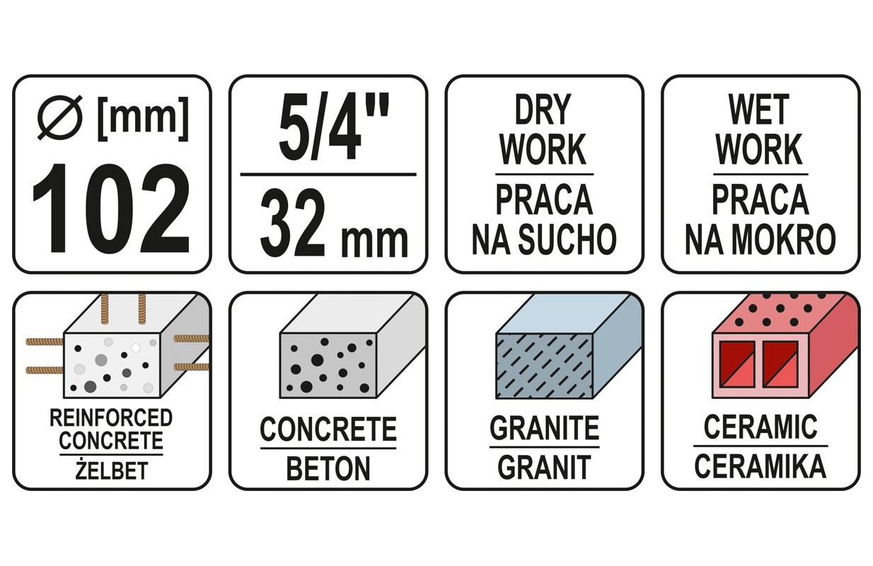 YATO crown drill bit for drill rig designed for non-hammered operation – dry and wet – with a drill rig (such as YT-81980). Allows fast and precise drilling of holes, even without a tripod, in reinforced concrete, concrete, silicate, such as. under electrical boxes, drilling ceilingsów for pipes and cables, installation of cable routes or ventilation ductsów.