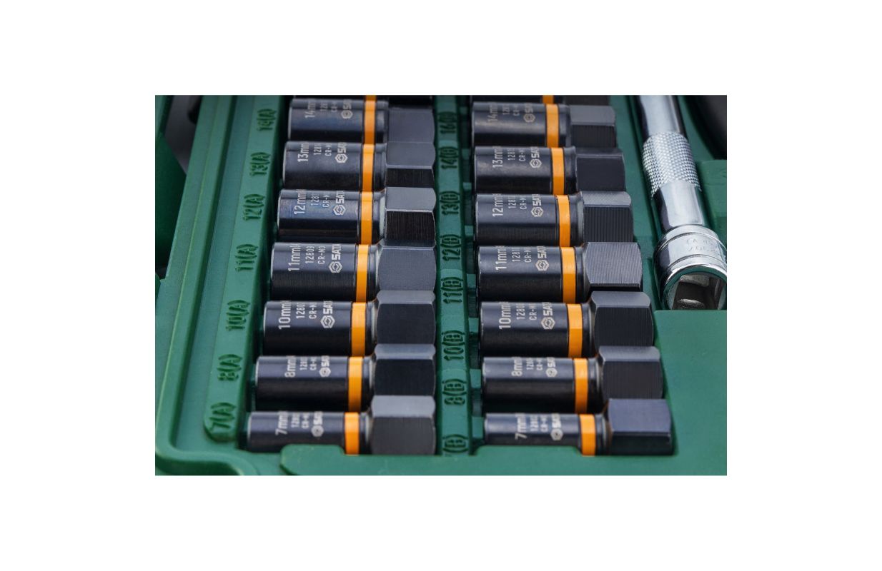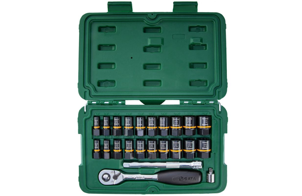 16 pcs. 3/8" sockets 10, 10, 11, 11, 11, 12, 12, 13, 13, 14, 14, 16, 16, 17, 17, 19, 19 mm