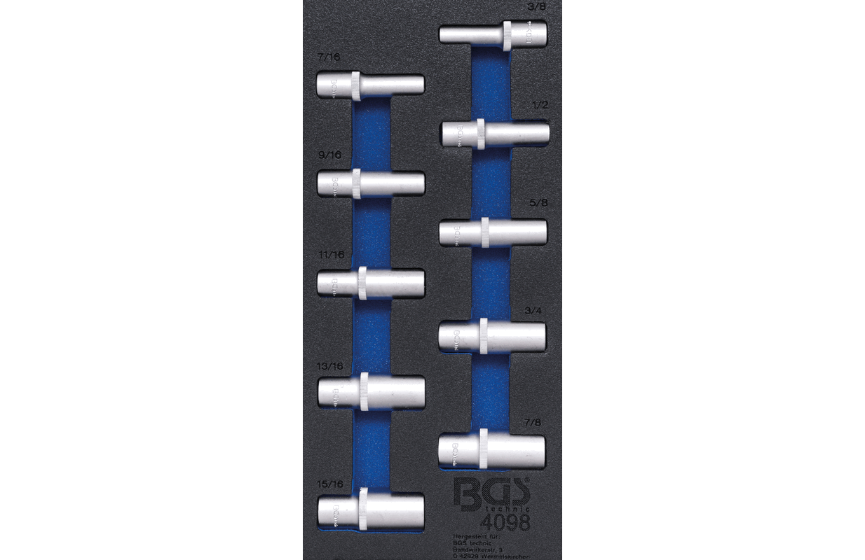 • 10 sockets, 12.5 mm (1/2“) drive: 3/8" - 7/16" - 1/2" - 9/16" - 5/8" - 11/16" - 3/4" - 13/16" - 7/8" - 15/16"