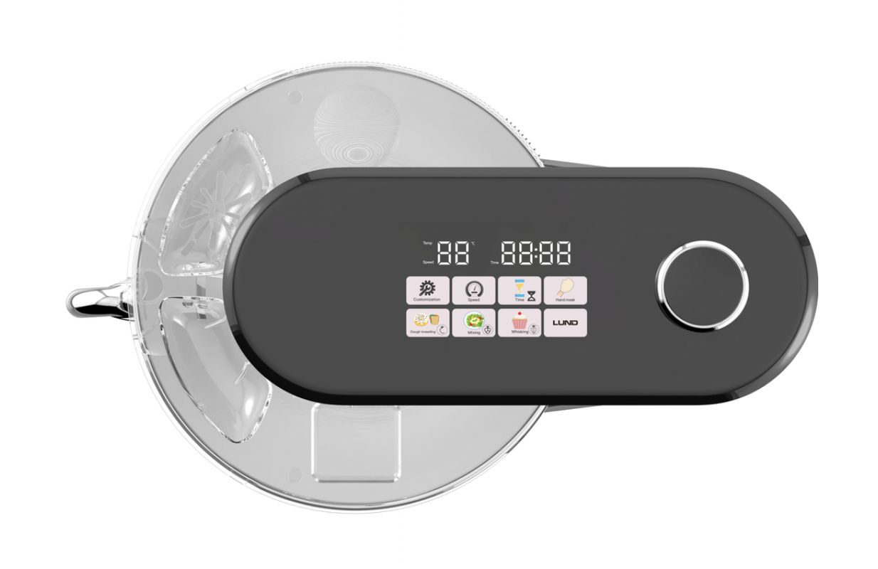 The mixer is equipped with a modern control panel with an LED display and a rotary knob with a switch. The display shows the current beater speed and working time, and the touch buttons allow quick selection of functions and programs. The panel allows manual setting of working time and rotational speed or using ready-made automatic programs: