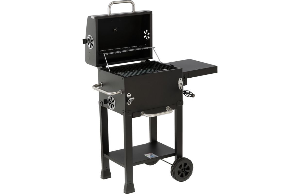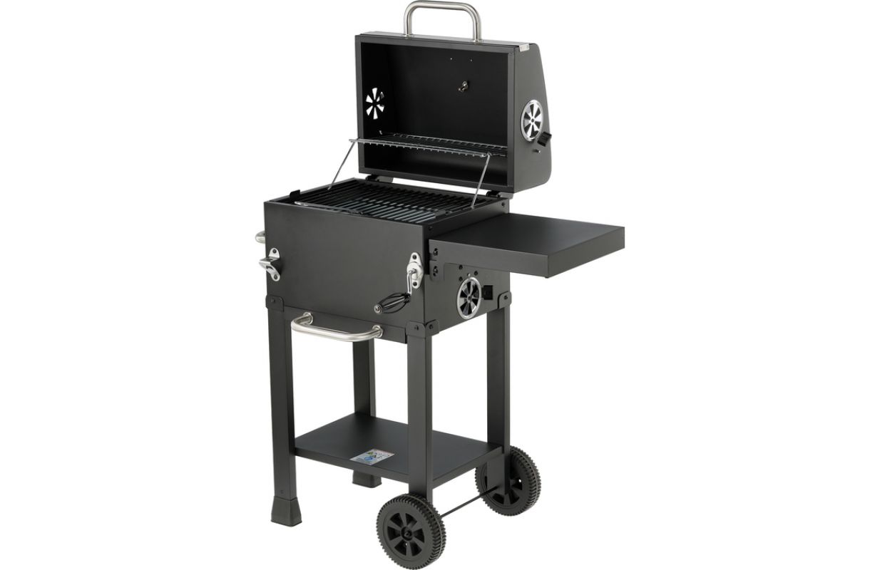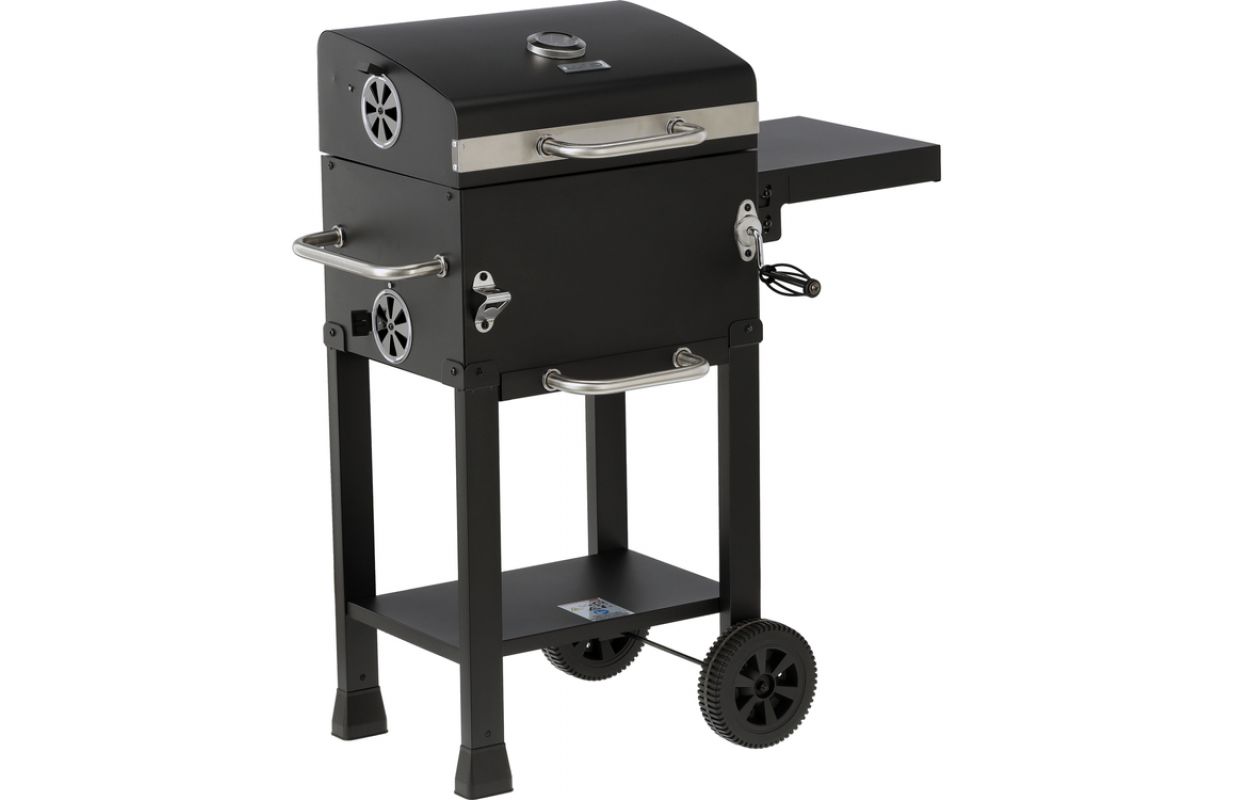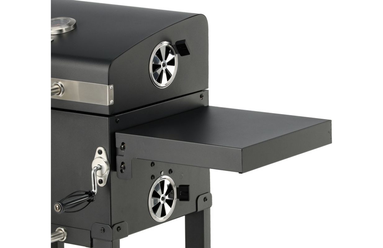 Practical shelves and handles - a folding side shelf serves as a worktop, and the lower shelf can hold charcoal, dishes, or grill accessories. Steel handles allow you to conveniently hang tongs or a spatula and operate the grill.