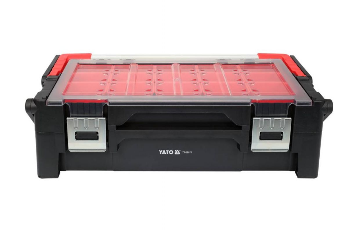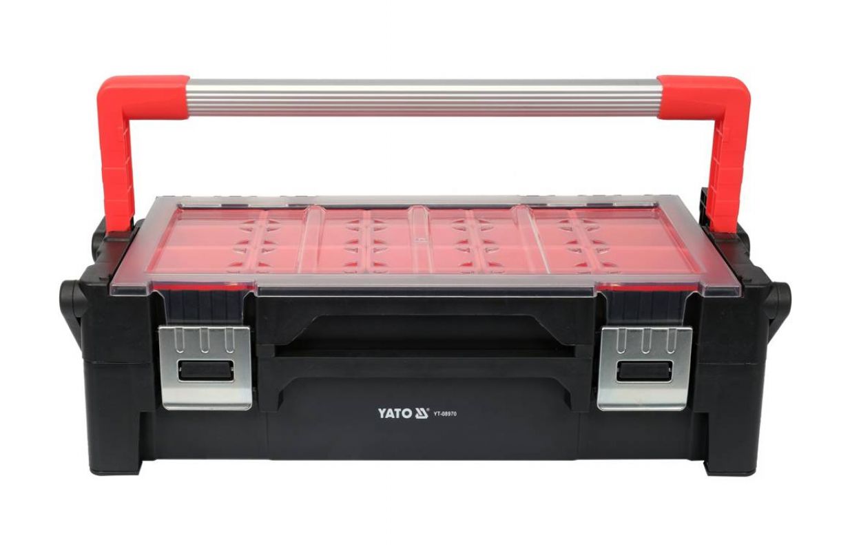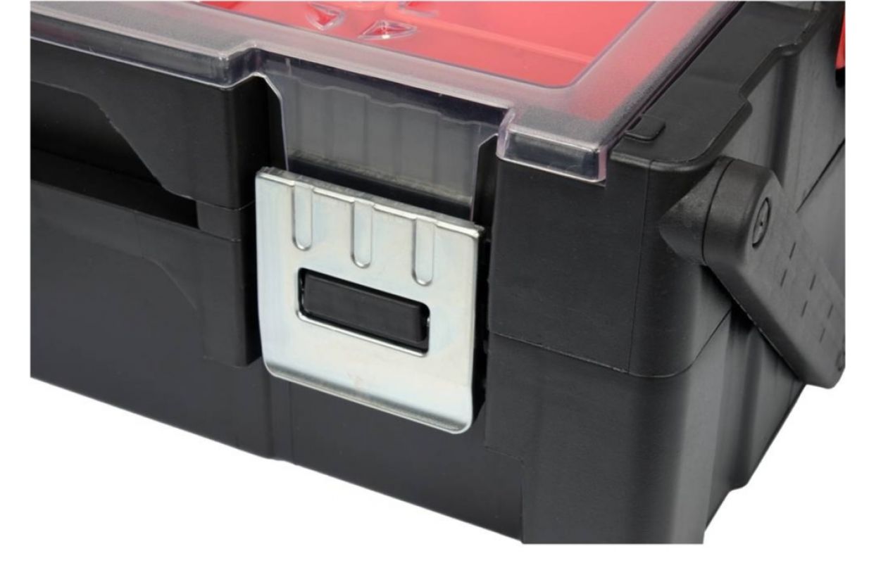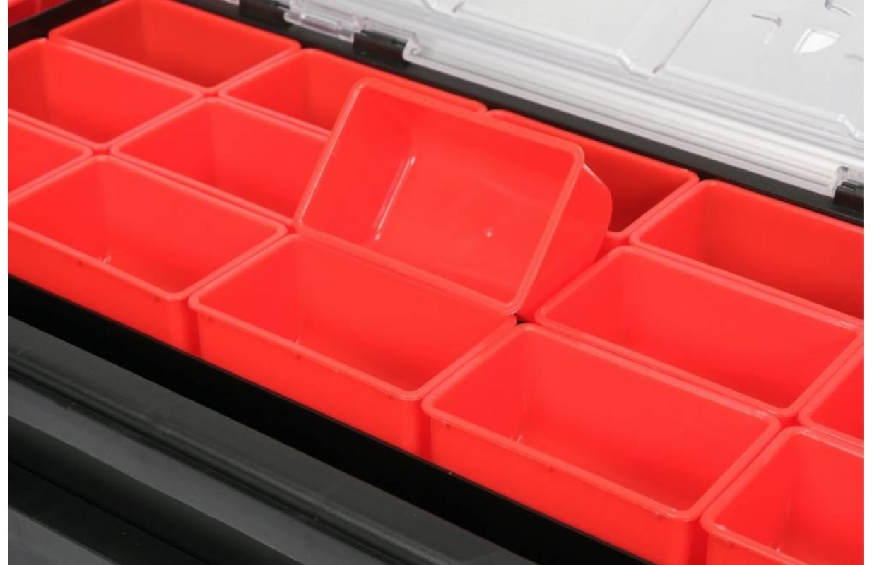 Folding, two-tier organizer for storing small work materials needed in the workshop and garage.