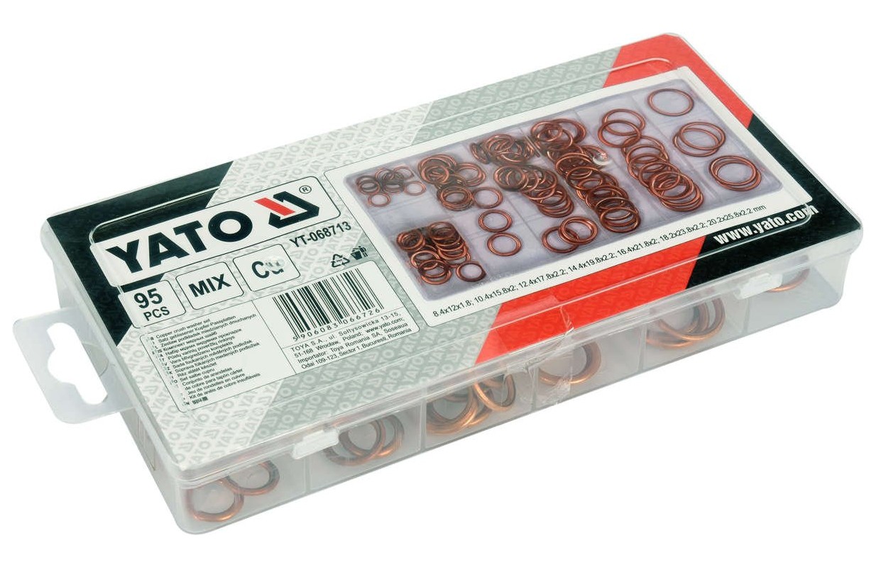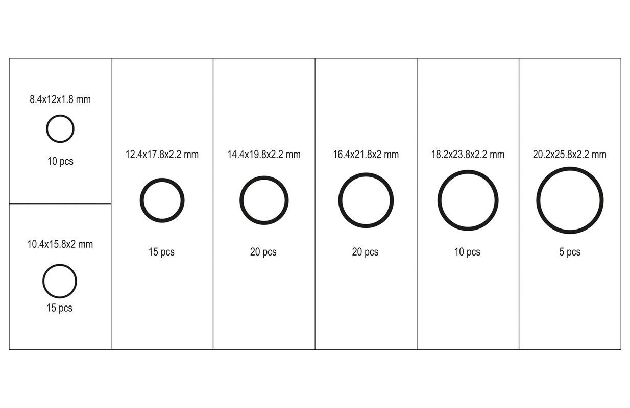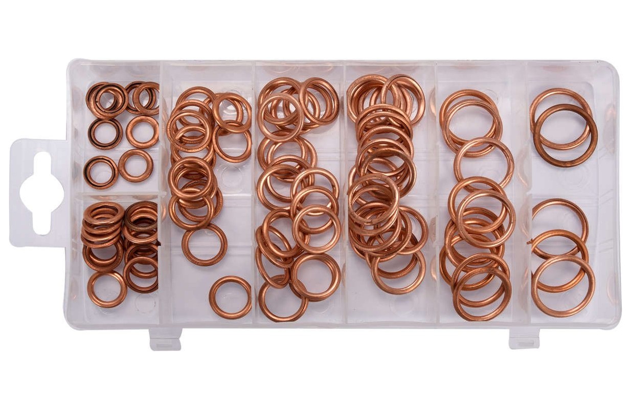 Set includeswashers x95 (Ø8.4x12x1.8 mm x10, Ø10.4x15.8x2 mm x15, Ø12.4x17.8x2.2 mm x15, Ø14.4x19.8x2.2 mm x20, Ø16.4x21.8x2 mm x20, Ø18.2x23 .8x2.2 mm x10, Ø20.2x25.8x2.2 mm x5)