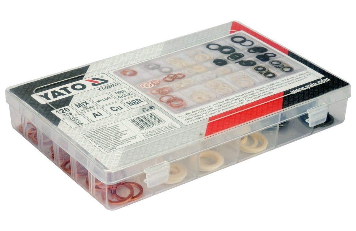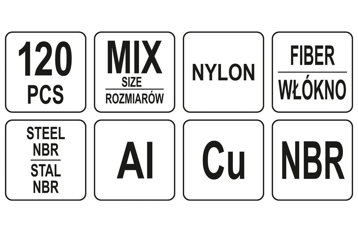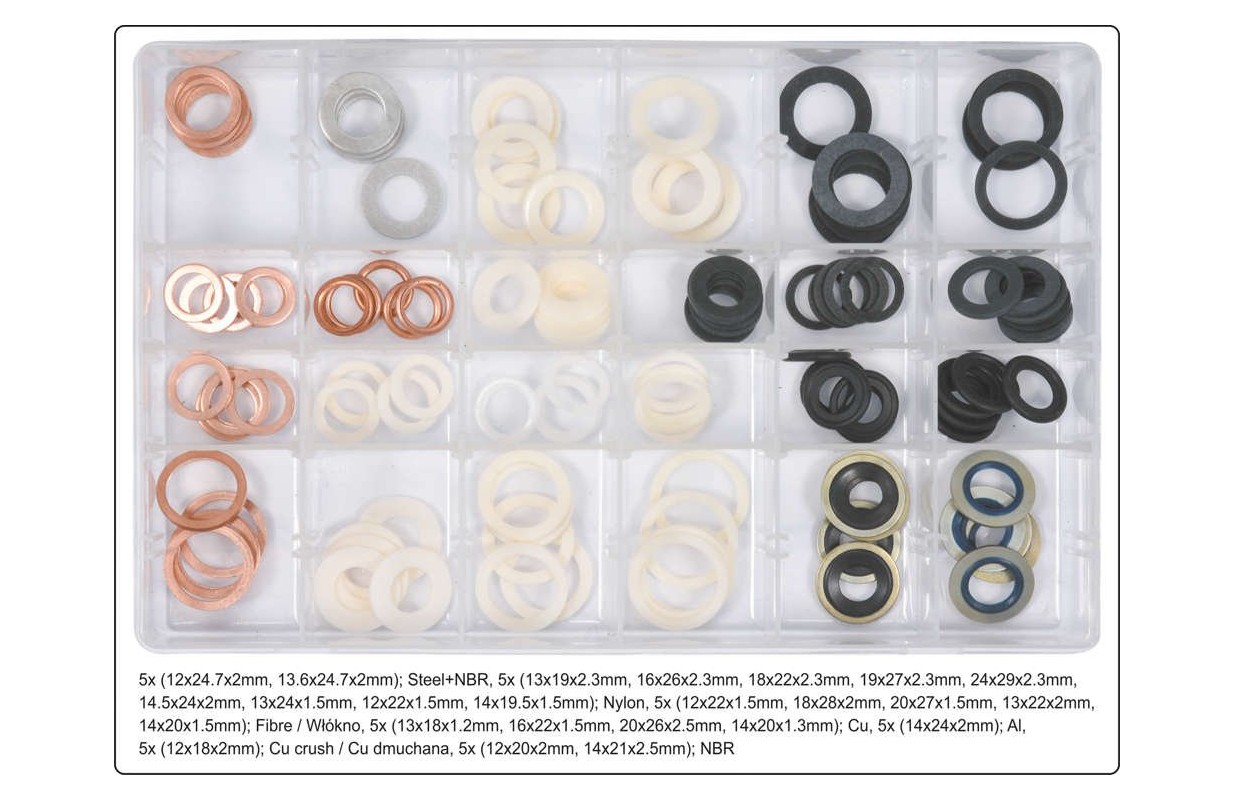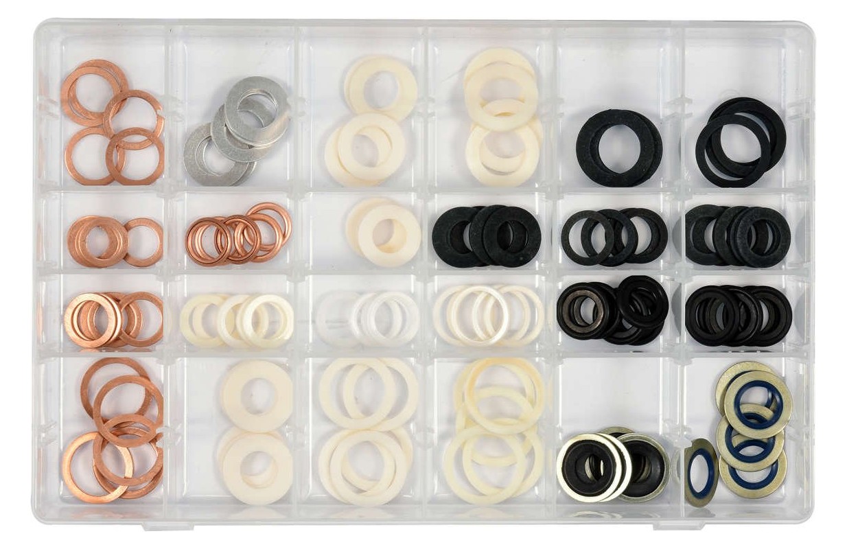 A set of 120 oil drain plug washers. The whole set is placed in a convenient sorting package. The set includes washers made of aluminum, metal and rubber, nylon, fiberóthread and copper.