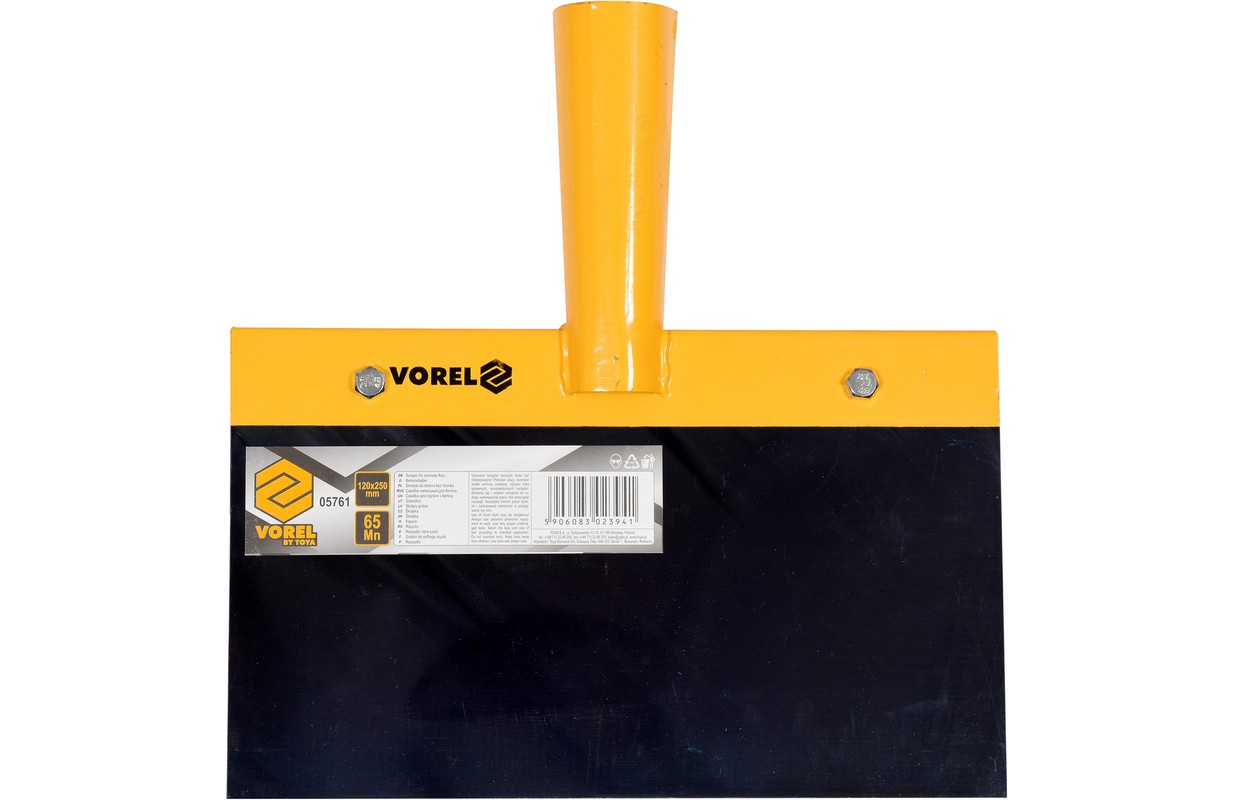 Concrete scraper 75 x 250 mm without handle Blade - material steel 65 mn. Thickness 0,9 mm , two holes for fastening , with screws M 5, For leveling hard surfaces such as, concrete screeds , formwork , floors etc. for removing old tar paper or floor coverings etc.