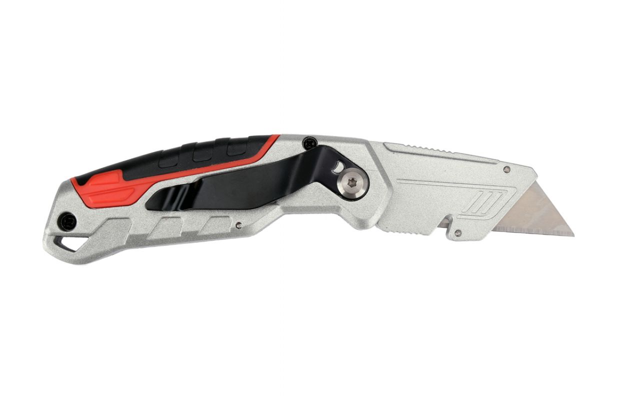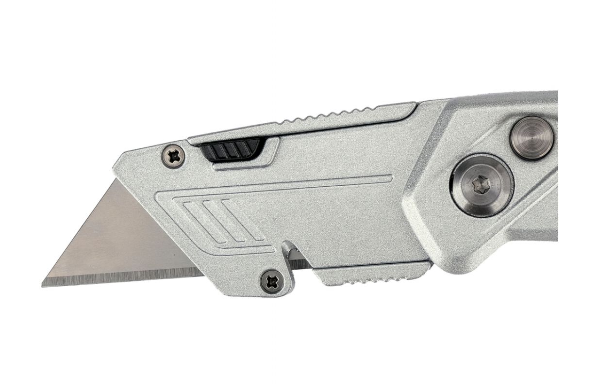 Trapesoidal blade knife designed for intensive assembly and warehouse work, where a strong and stable blade is required. The aluminum body supplemented with ABS and TPR elements increases resistance to damage, while improving grip when cutting harder materials. The SK5 tool steel blade ensures high durability and repeatable cutting quality.