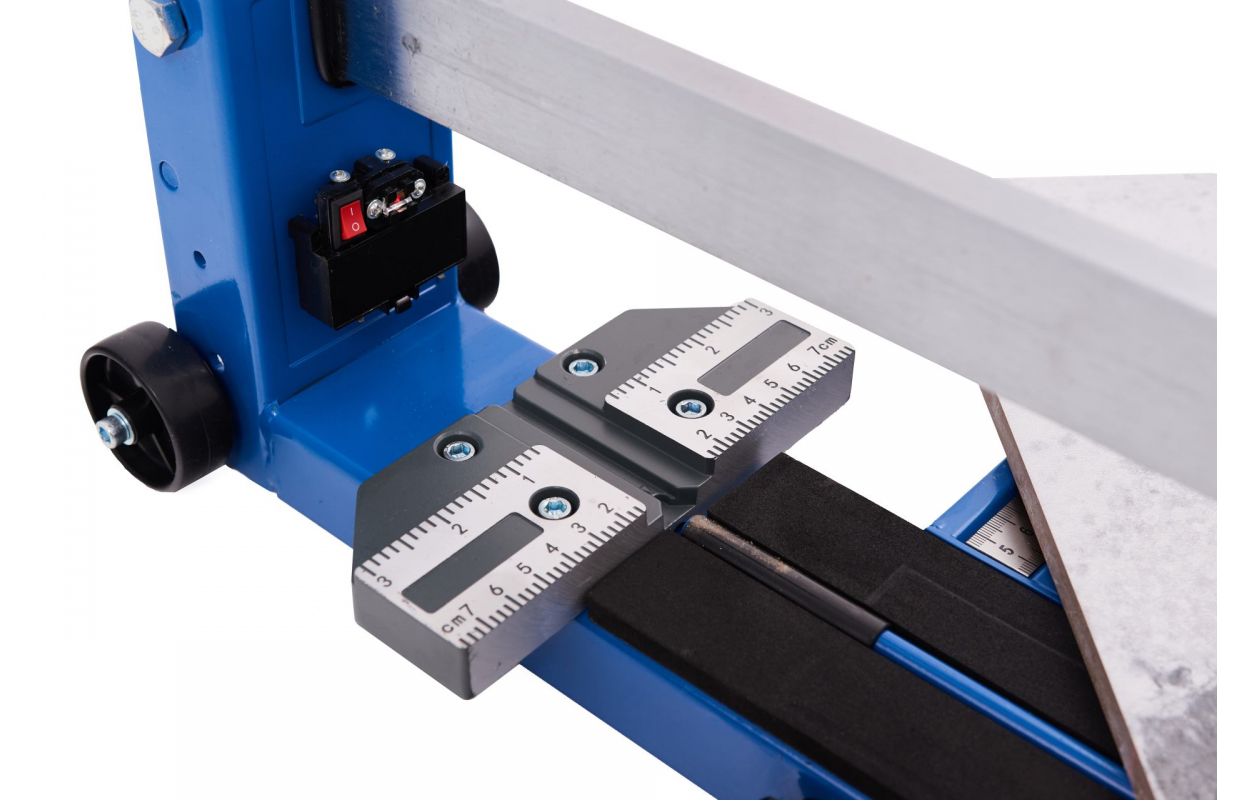 Additionally, two side supports with a length of 28 cm, covered with foam, ensure stability during cutting. The cutter is also equipped with a side support for positioning during diagonal cutting, expanding the range of applications for this professional tool in ceramic tile processing.
