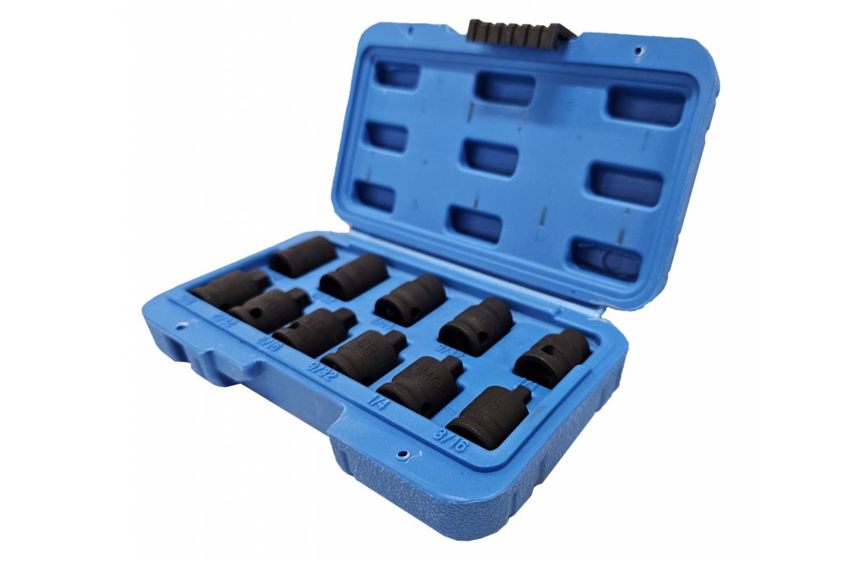 3/8" Dr. Female: 1/4", 9/32", 5/16", 11/32", 3/8"; Beveled female square drive 3/8" Dr. Male: 3/16", 1/4", 9/32", 5 11/32", 3/8" Conical external square drive, made of CR-MO impact steel with a black phosphate coating. Conical square drive with external thread and square drive with bevel quickly align the socket with the fastener.