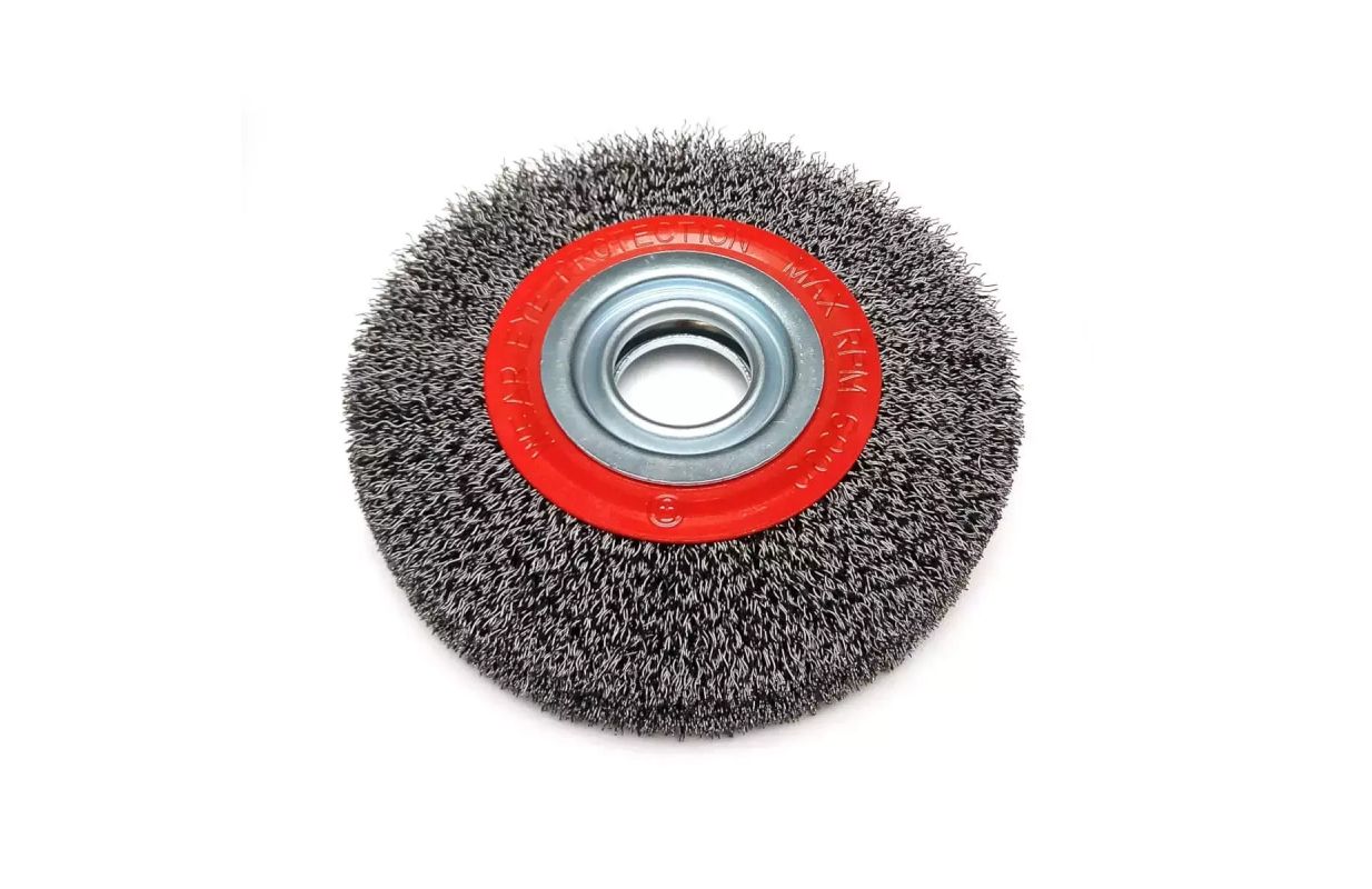 The wire brush is designed for use with bench grinders. It is used for deburring, removing old coatings, cleaning and matting materials such as steel, structural steel and wood.