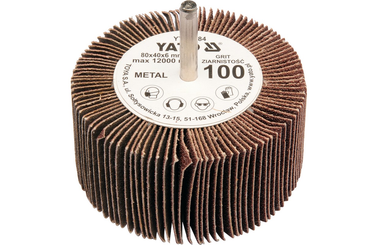 An abrasivewheel made of abrasive cloth leaves permanently mounted on a metal mandrel.
